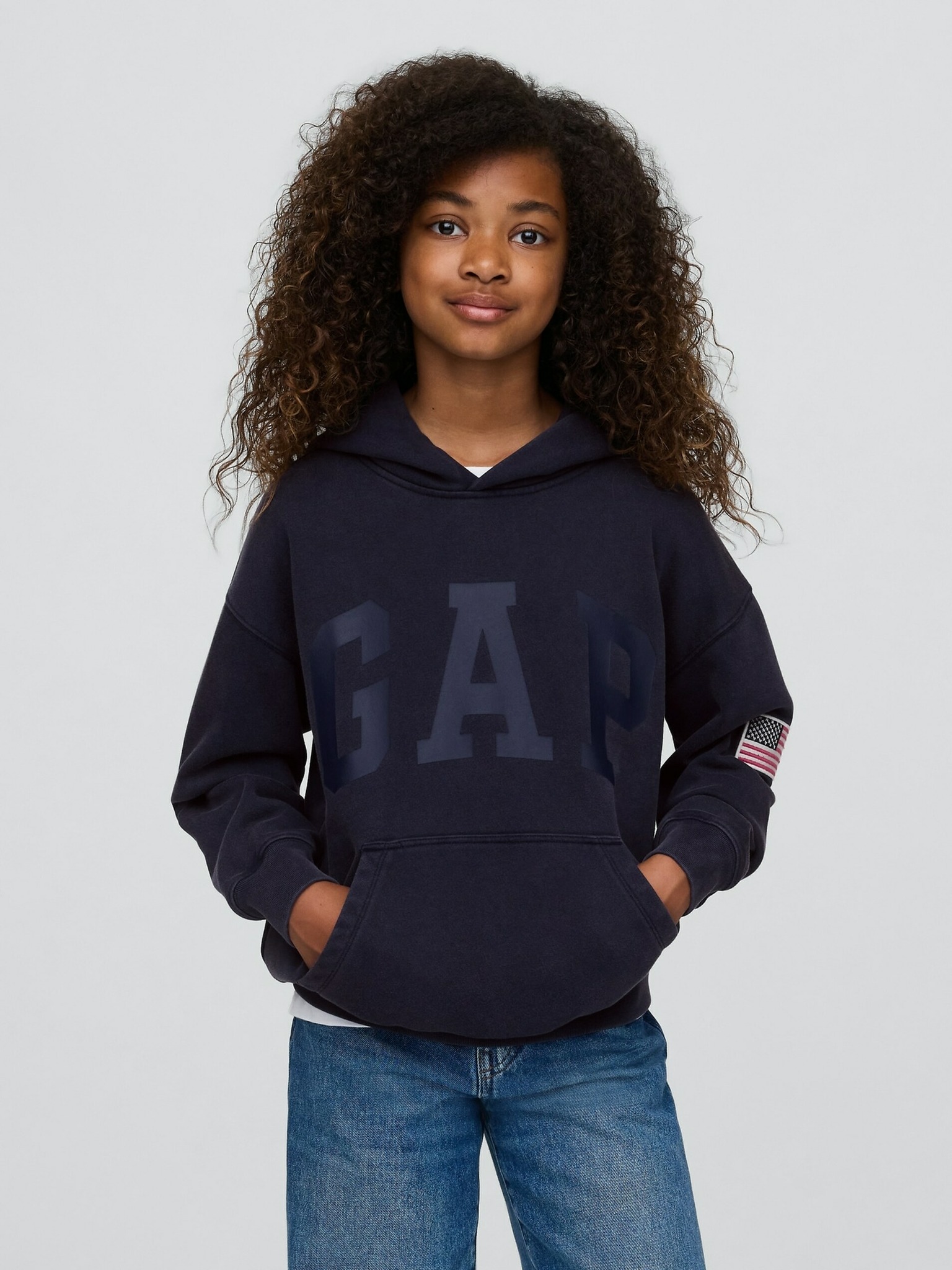 • Fiú kapucnis pulóver puha fleece anyagból, Gap logóval és amerikai folttal – a kényelem, stílus és tudatos gyártás tökéletes kombinációja.