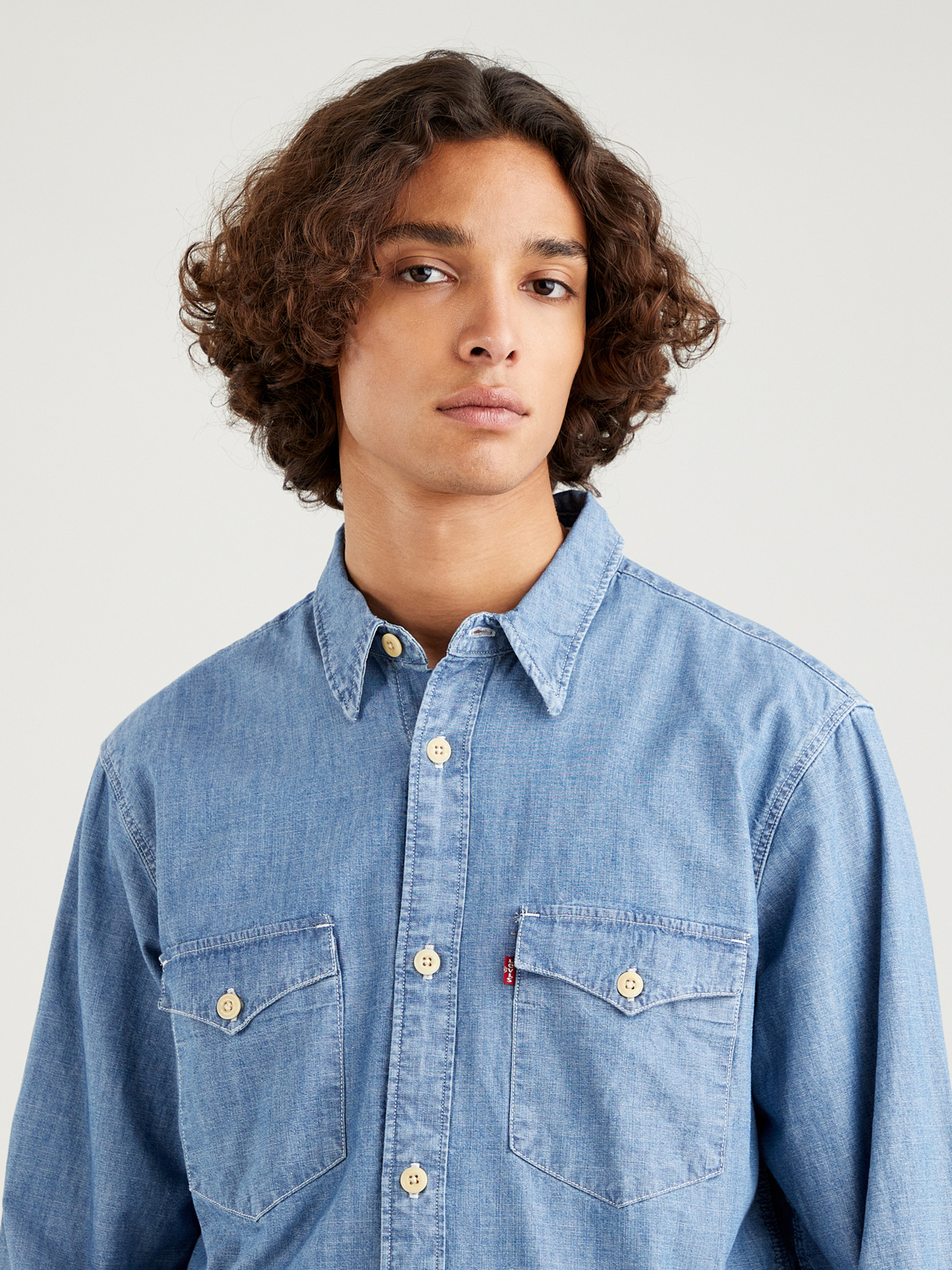 Férfi hímzett farmer ing zsebbel - világoskék Ombre Ruházat