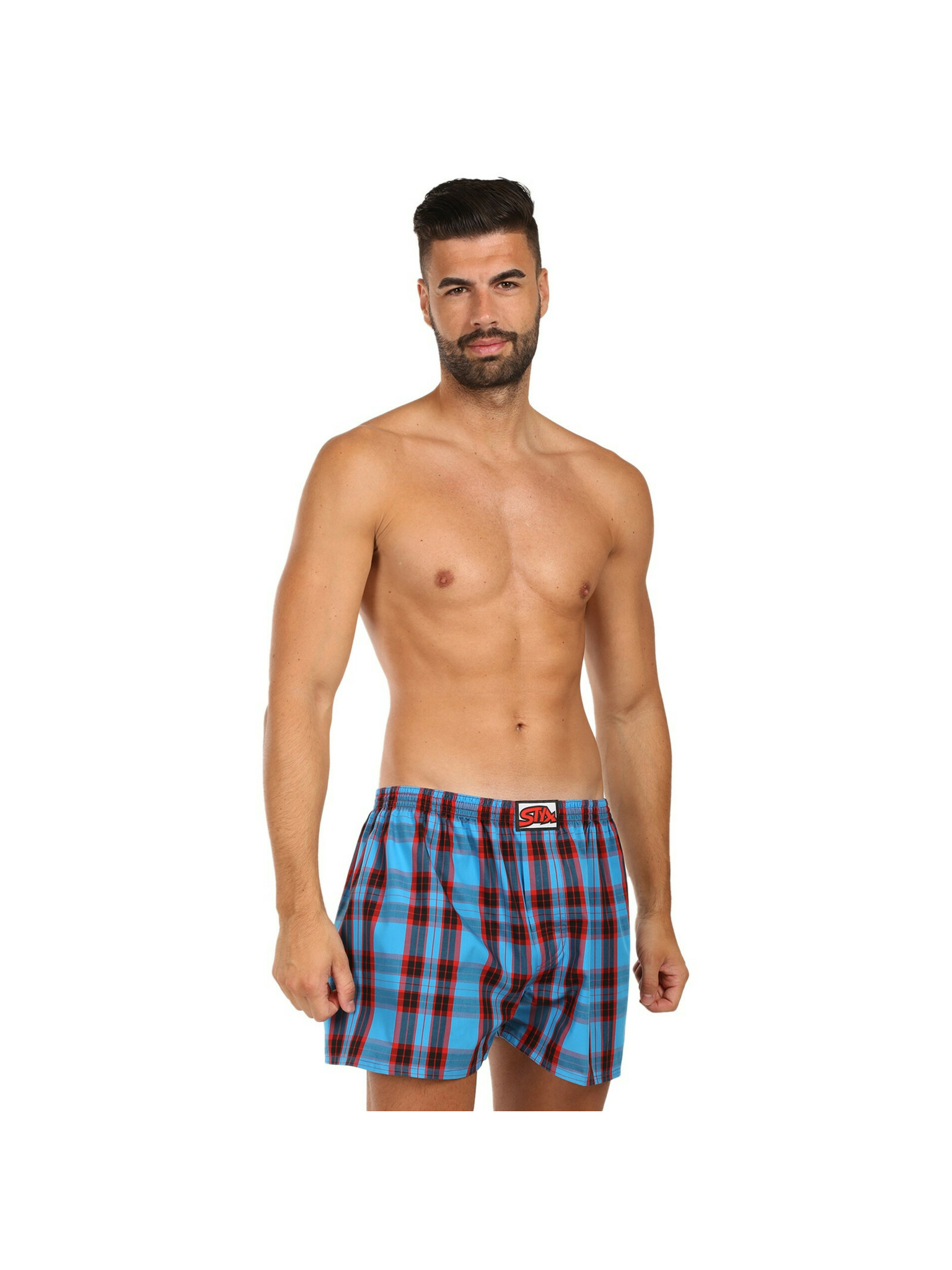 Három darabos férfi kockás rövidnadrág készlet piros, lila és kék színben STYX