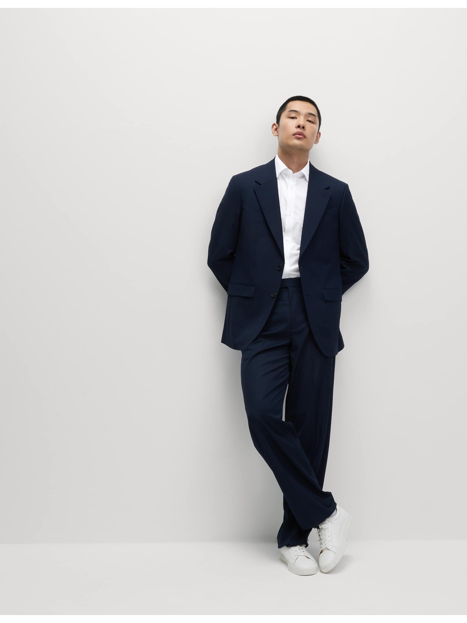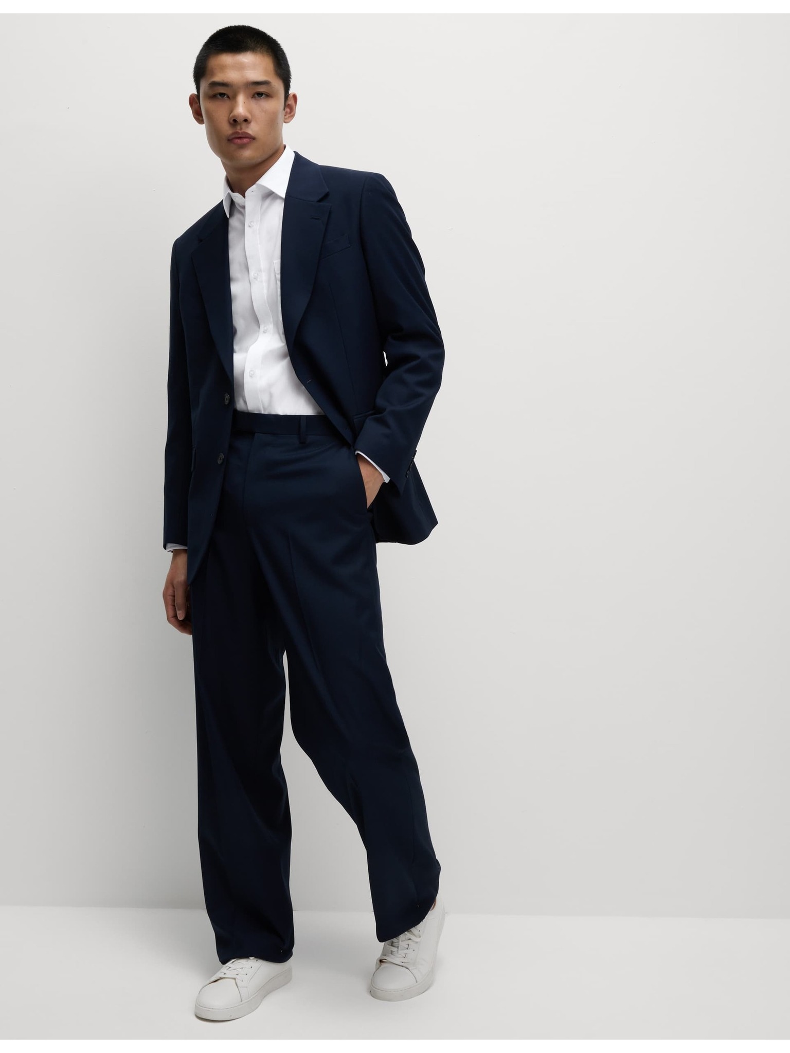 Marks & Spencer tengerészkék, keskeny szabású kevert szövetű ing luxus minőségű pamutból, dupla mandzsettával
