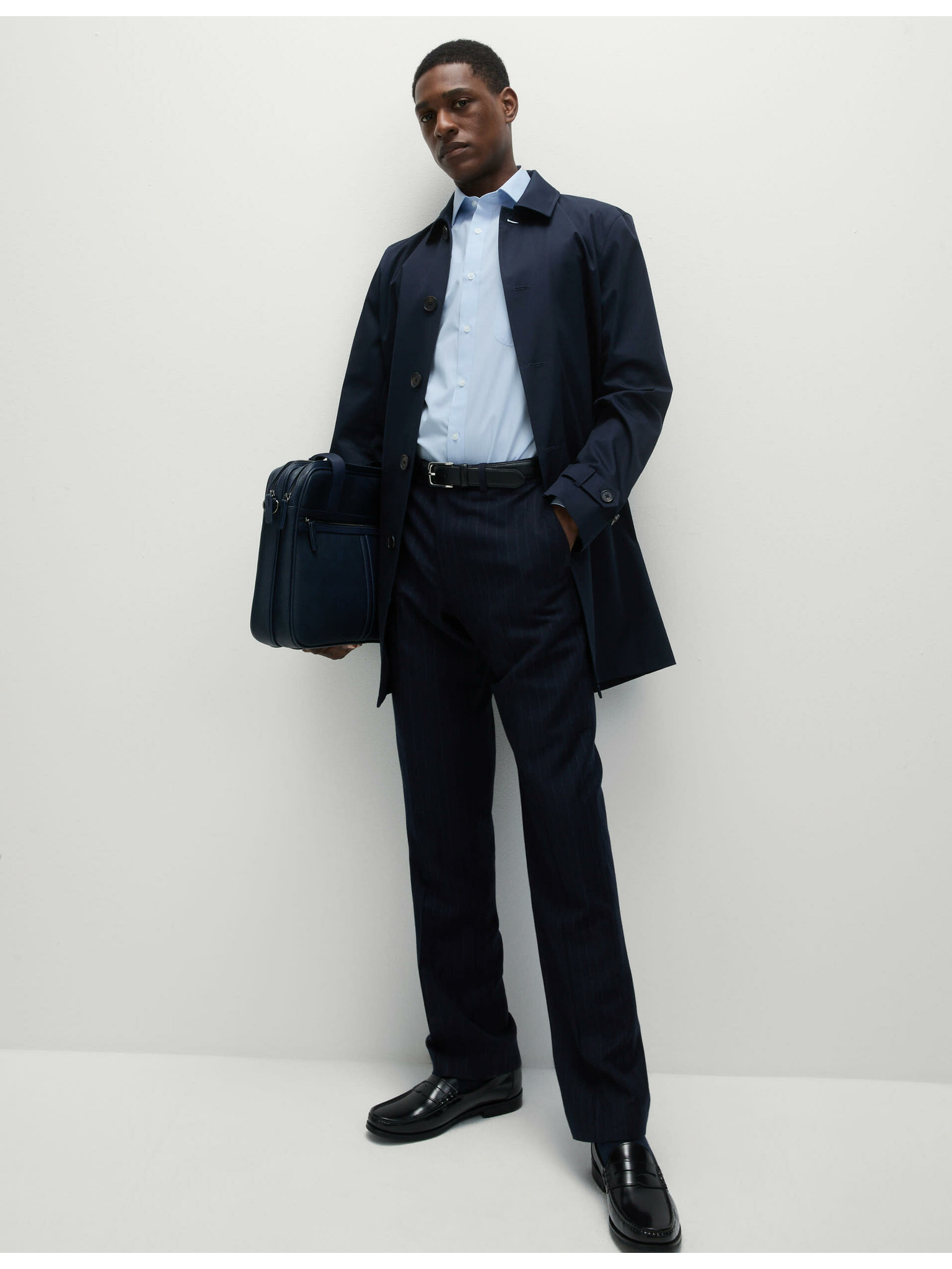 Marks & Spencer tengerészkék, keskeny szabású kevert szövetű ing luxus minőségű pamutból, dupla mandzsettával