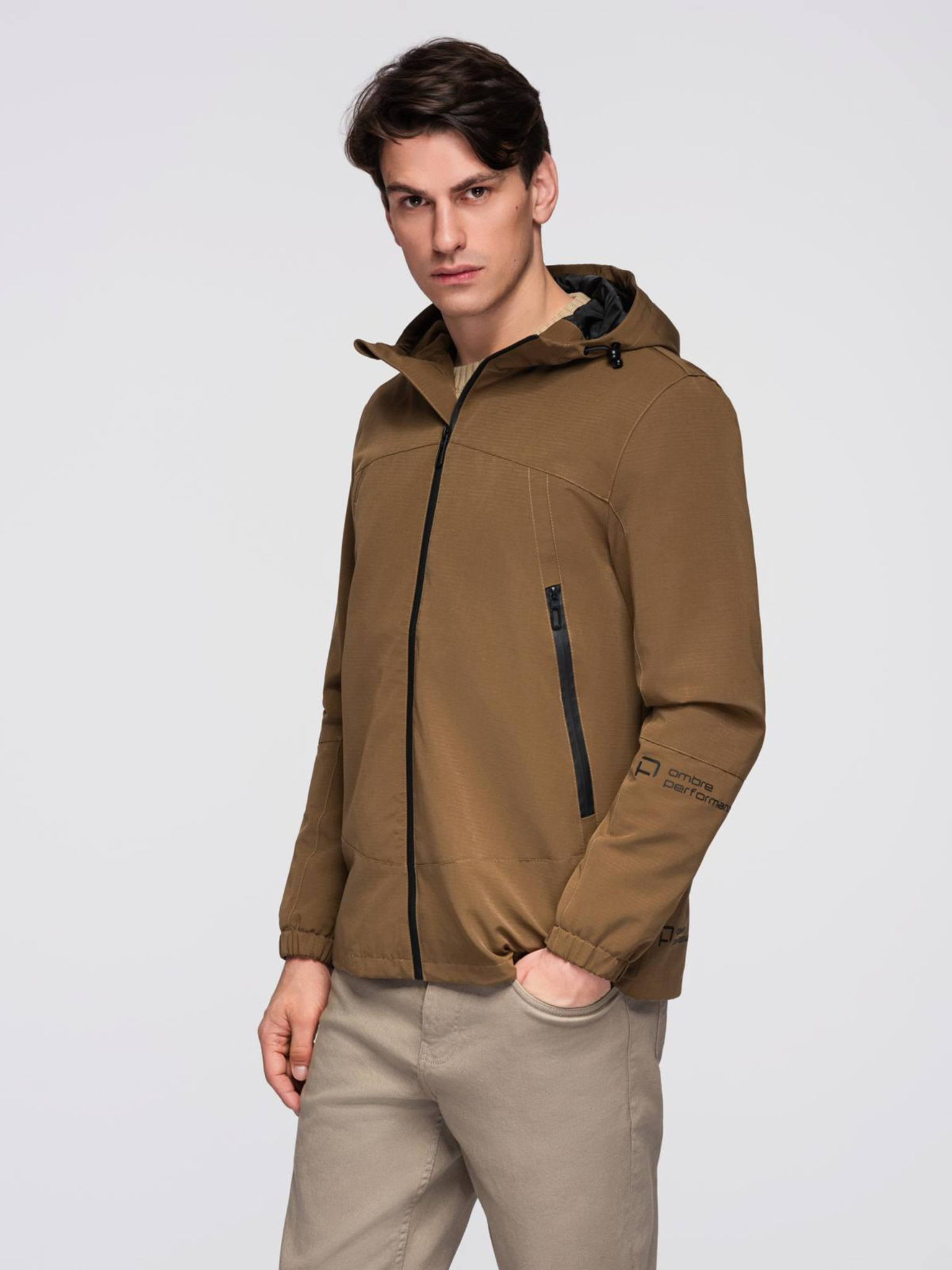 Férfi könnyű kabát regular fit béléssel és kapucnival - barnabézs V1 OM-JANP-0242 Ombre Clothing