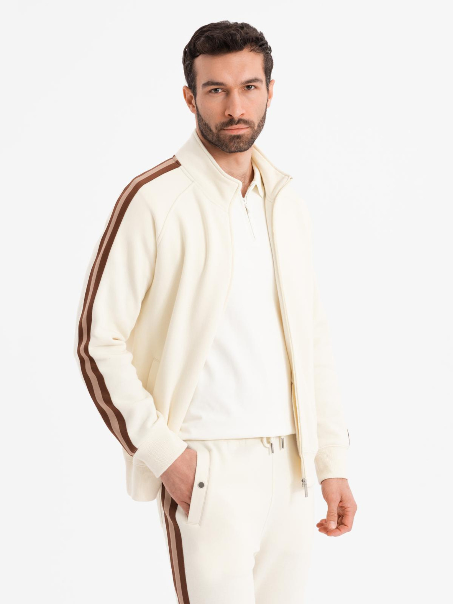 Férfi melegítő szett galleres pulóver + jogger nadrág - szürkésbarna V3 Z117 Ombre Clothing