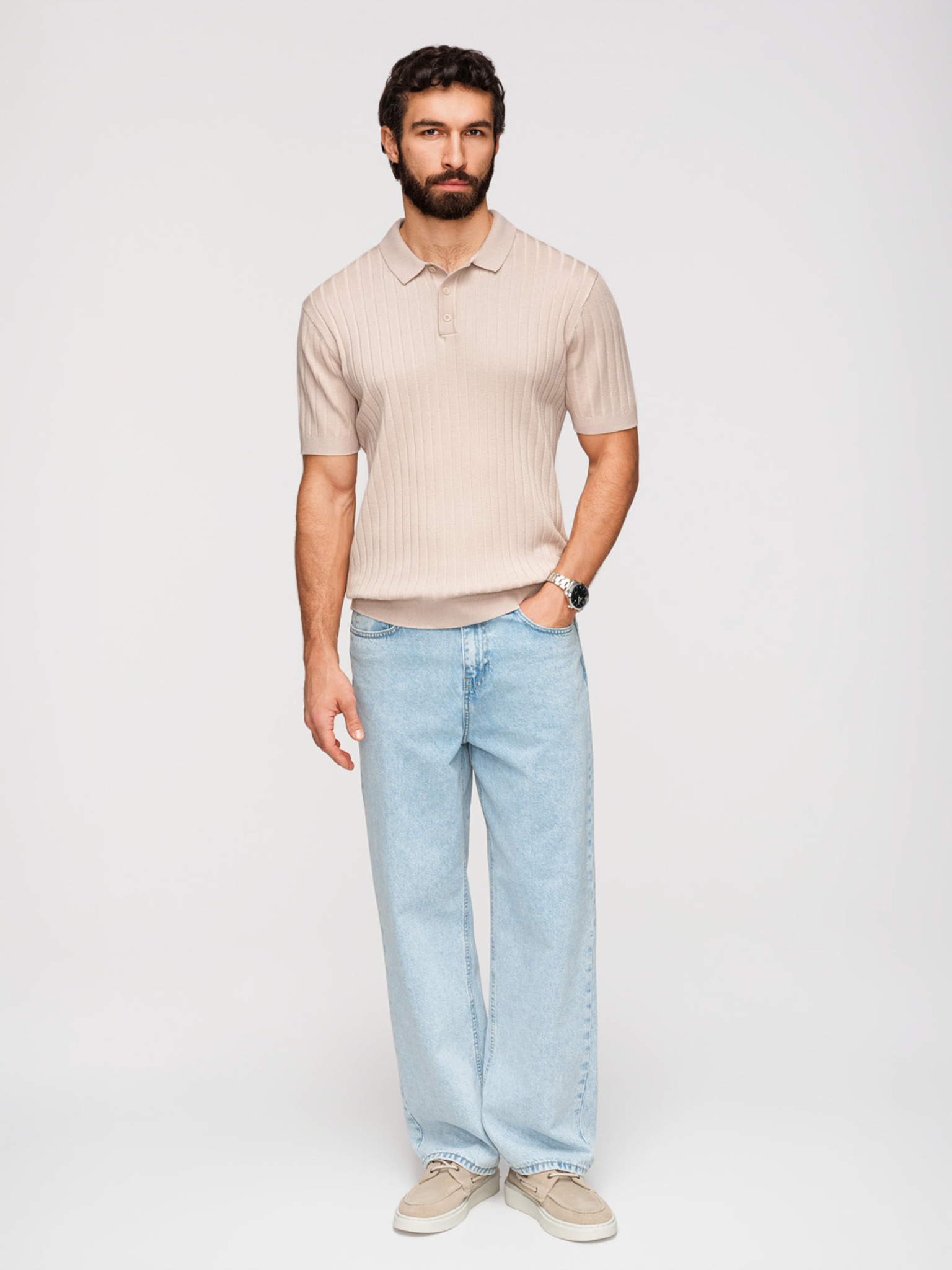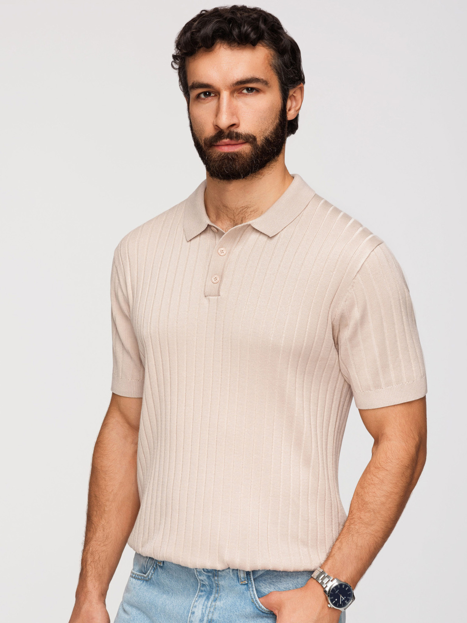 Férfi stílusos polópóló rugalmas anyagból - krémszín V2 OM-POSS-0150 Ombre Clothing