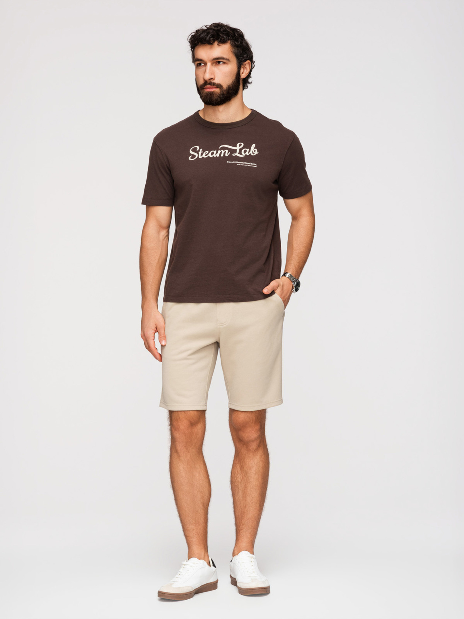 Férfi rövidnadrág REGULAR FIT francia frottír kötöttből - sötét bézs V2 OM-SRSK-0196 Ombre Clothing