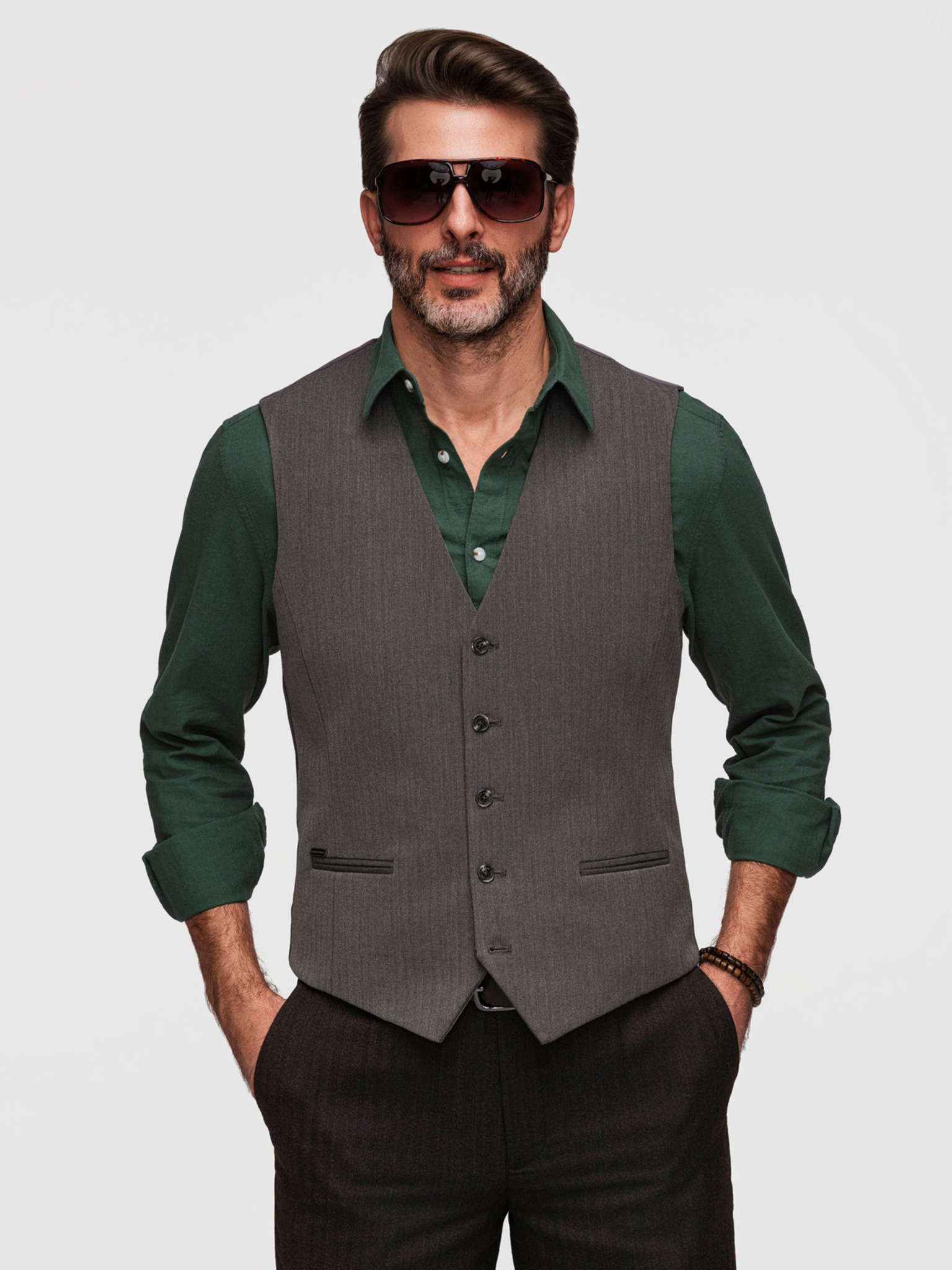 Elegáns klasszikus férfi mellény halszálka mintával SLIM FIT - szürke V1 V65 Ombre Clothing