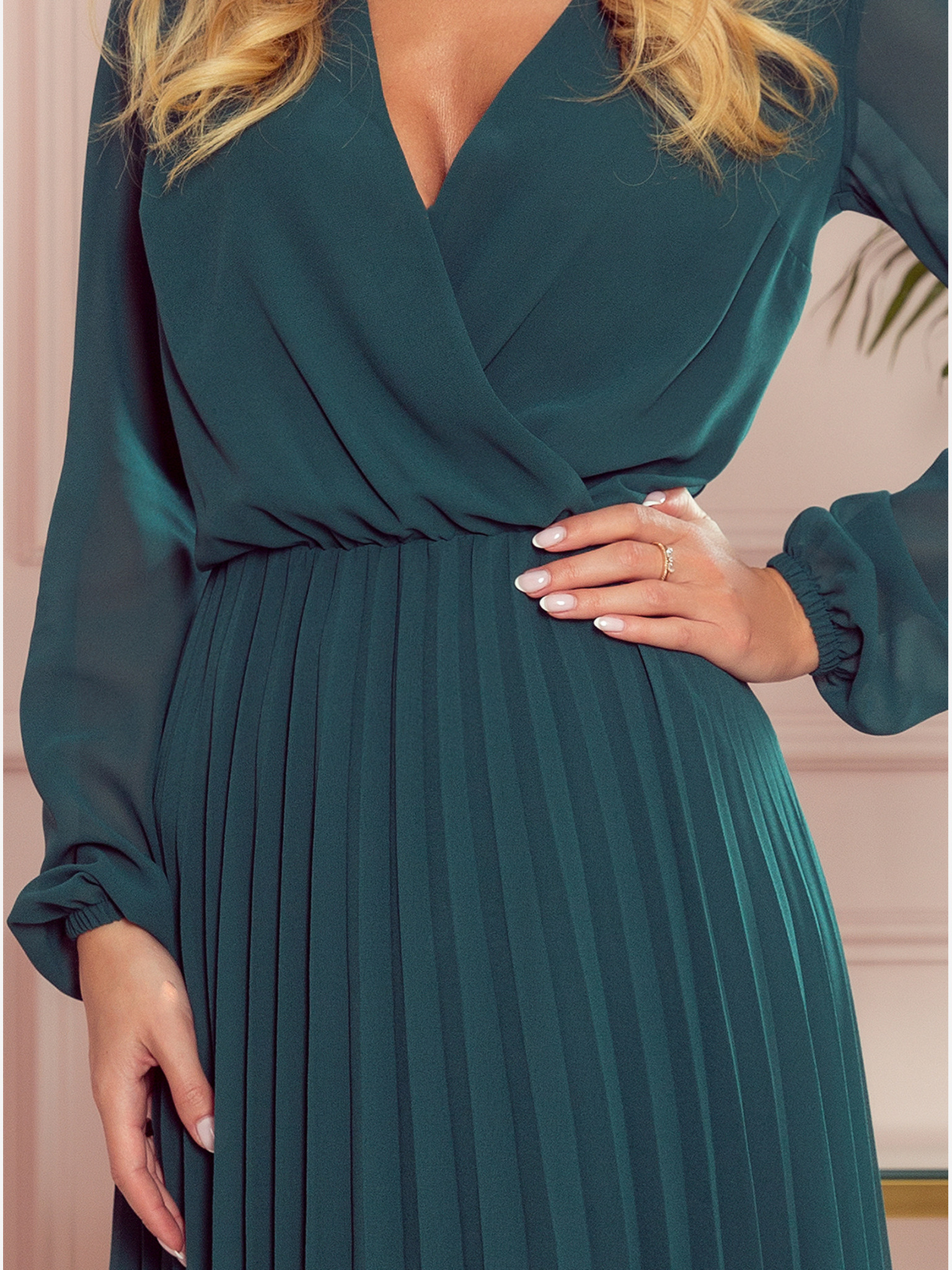Fitt ruha ceruza nyakkivágással és hosszú ujjakkal - zöld csillogással Numoco