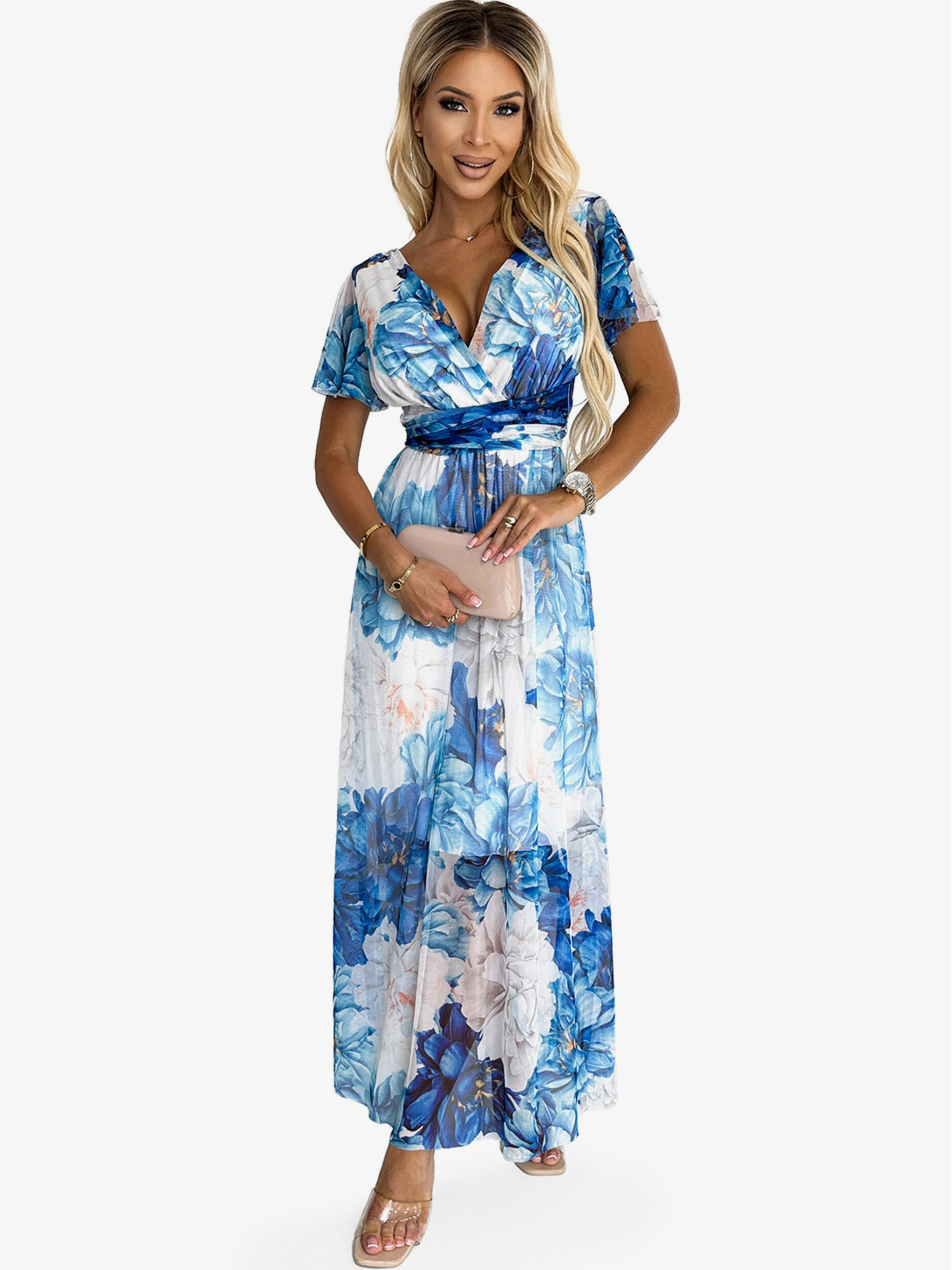 411-13 CRYSTAL csillogó hosszú ruha dekoltázzsal - világoskék csillogással