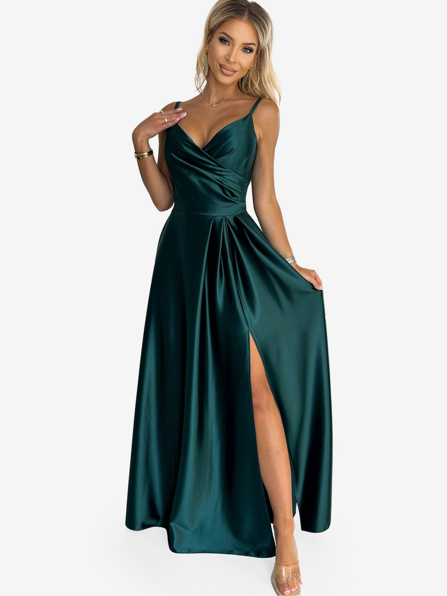 Elegáns szatén pánt nélküli maxiruha - zöld Numoco CHIARA