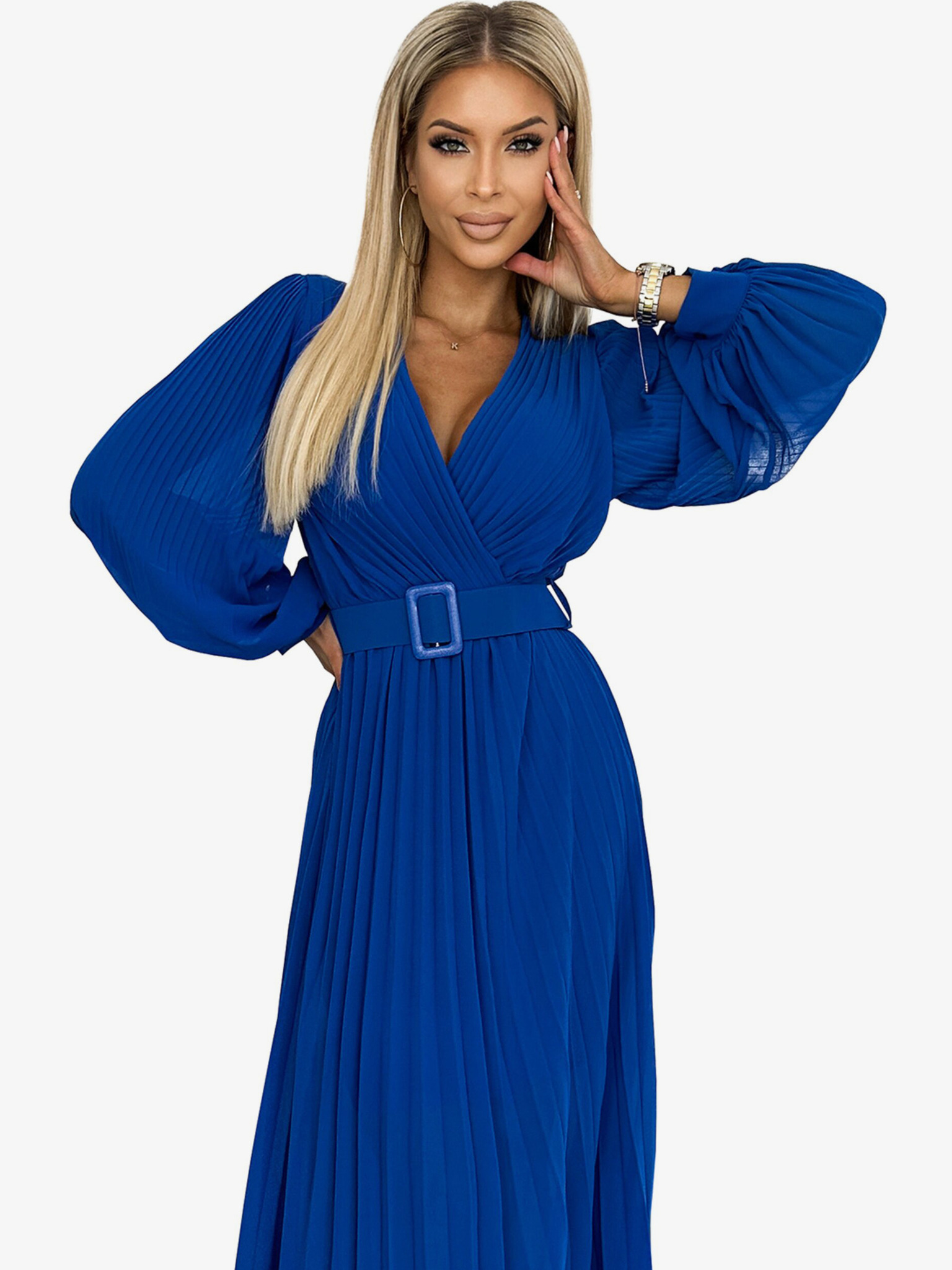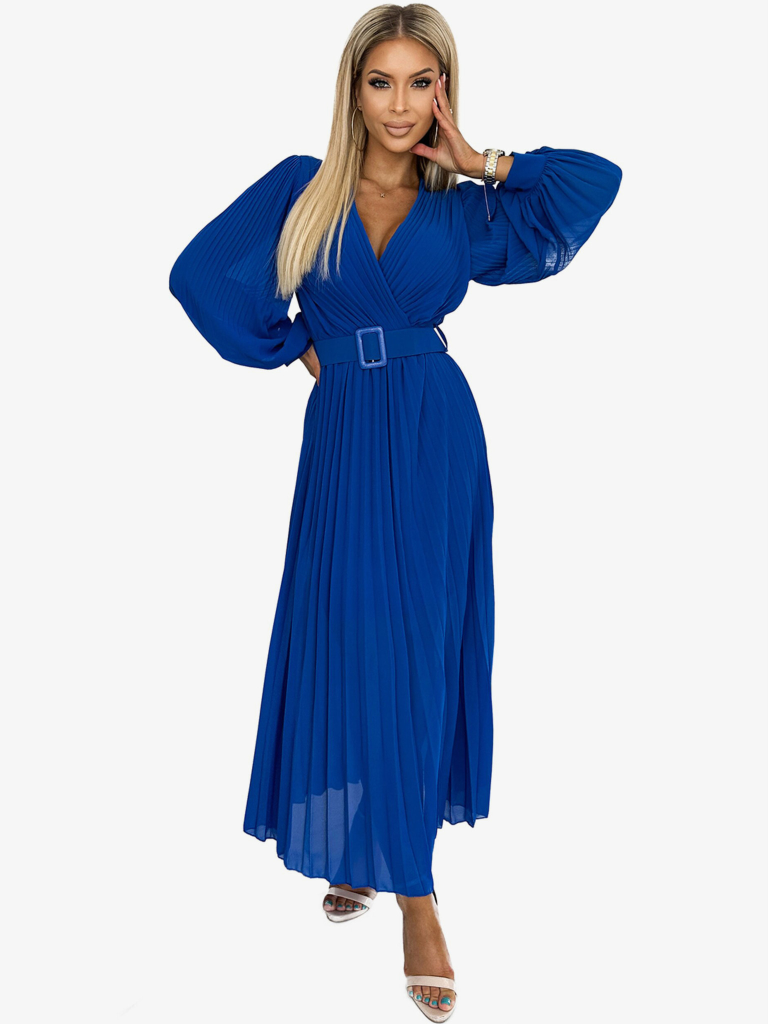 Fényes, hosszú ruha nyakkivágással, hosszú ujjakkal és lábszárrésszel Numoco