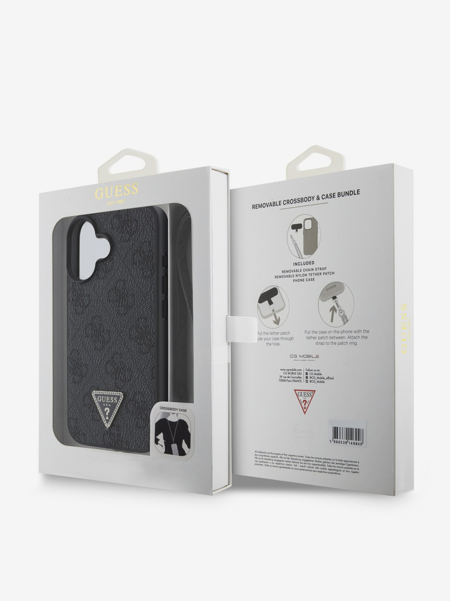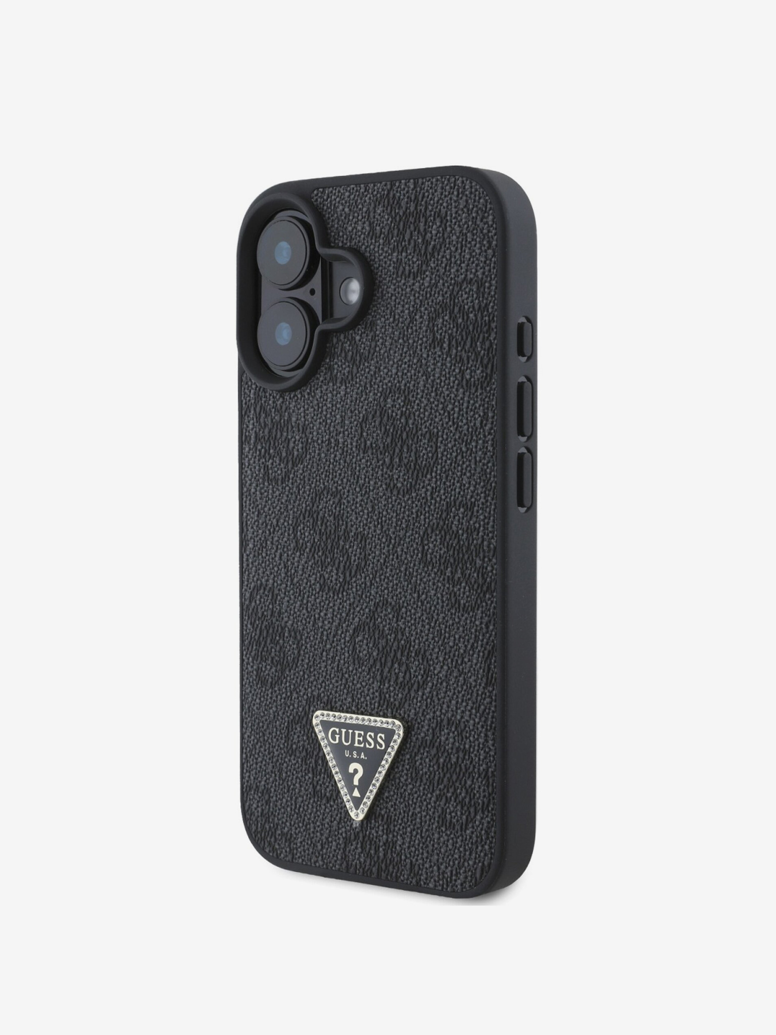 Guess PU 4G Strassz Háromszög Metal Logo Hátlap iPhone 16e Black