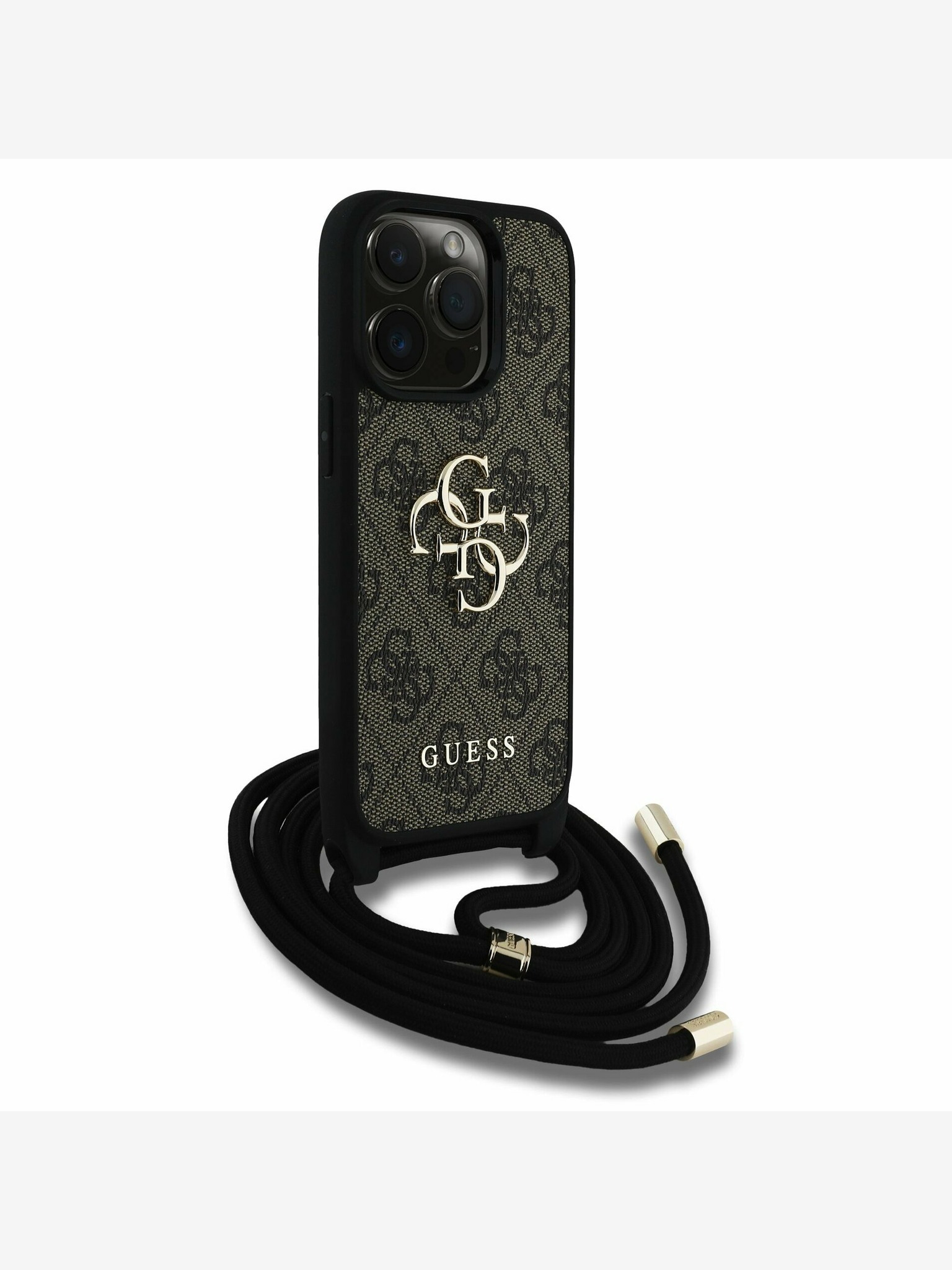 Guess PU 4G Strass háromszög logó állvány kamera keret MagSafe hátlap iPhone 16 Pro Brown