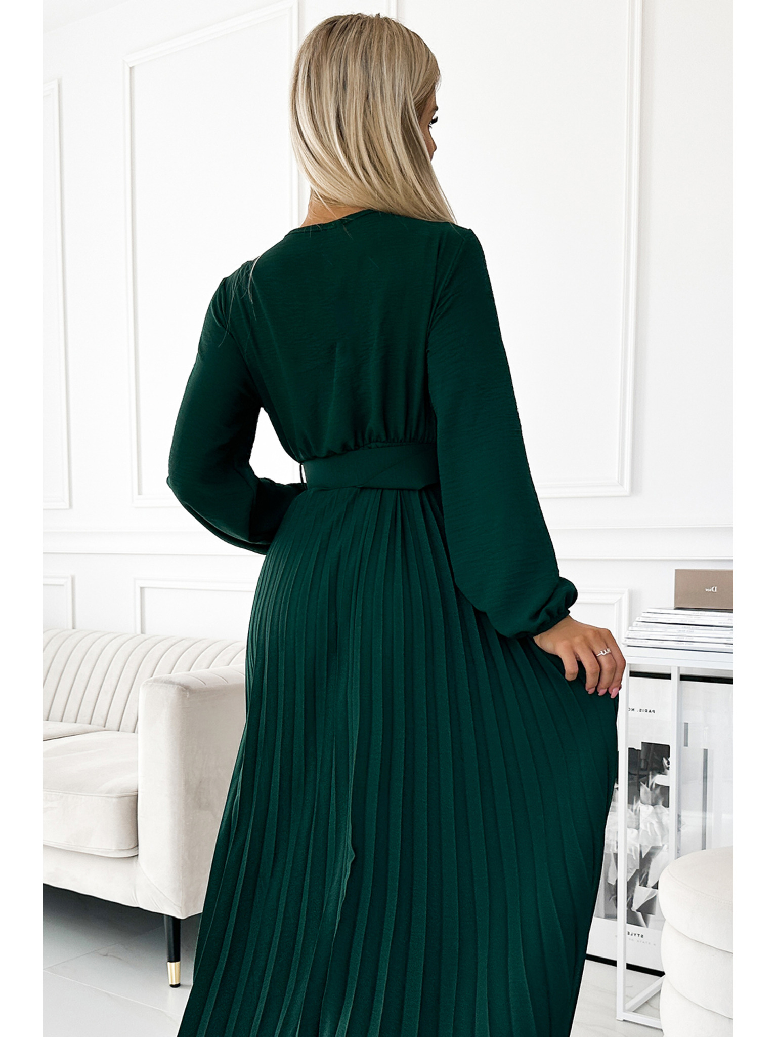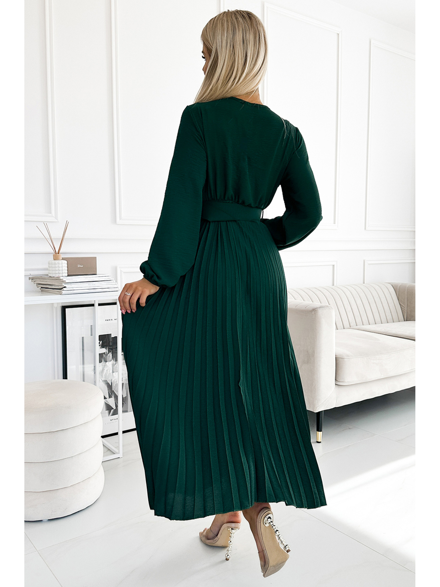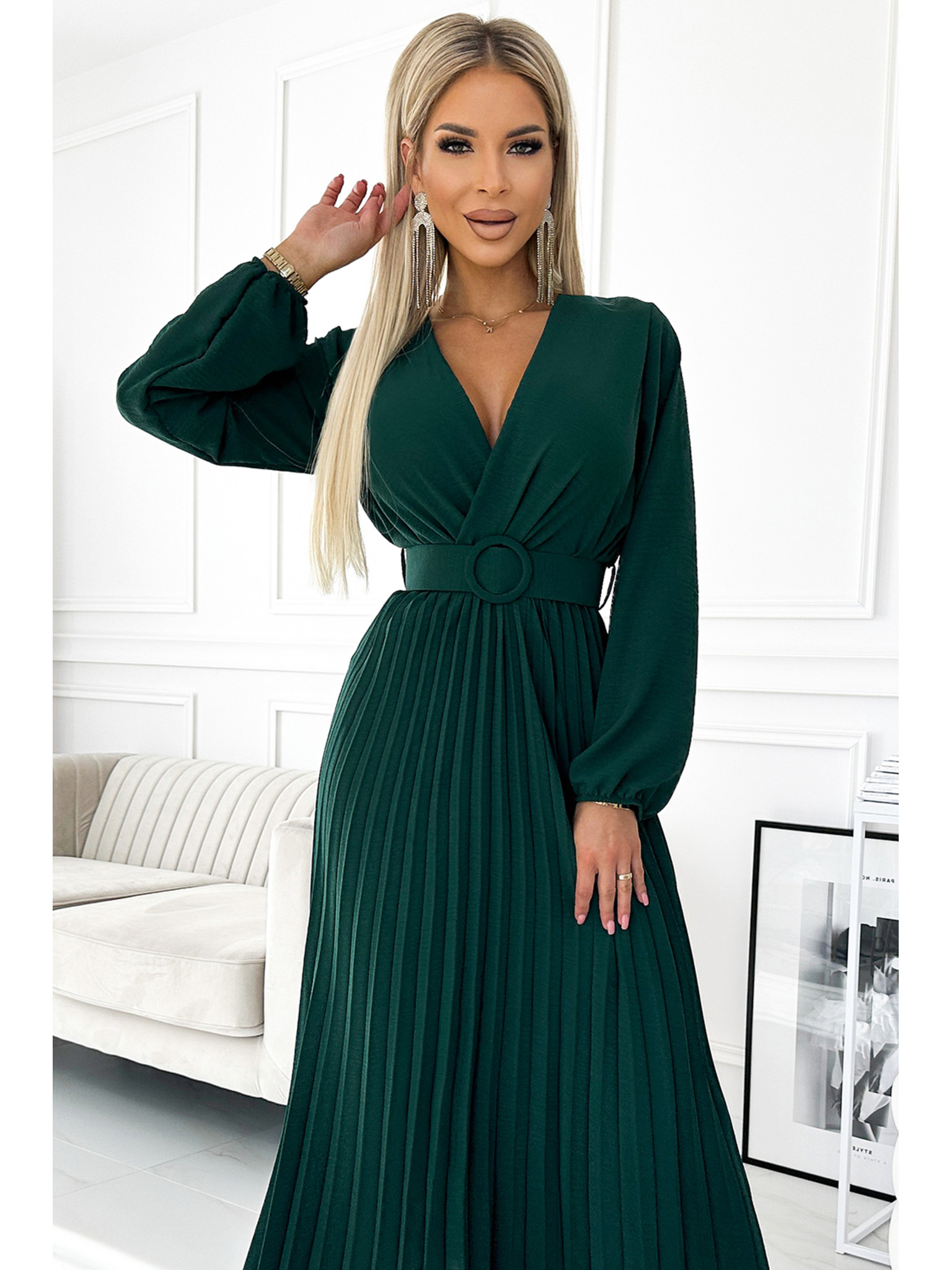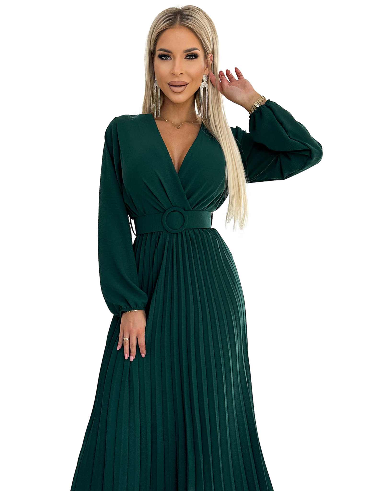 VIVIANA Fodros midi ruha lapos nyakkivágással, hosszú ujjakkal és széles övvel - zöld Numoco