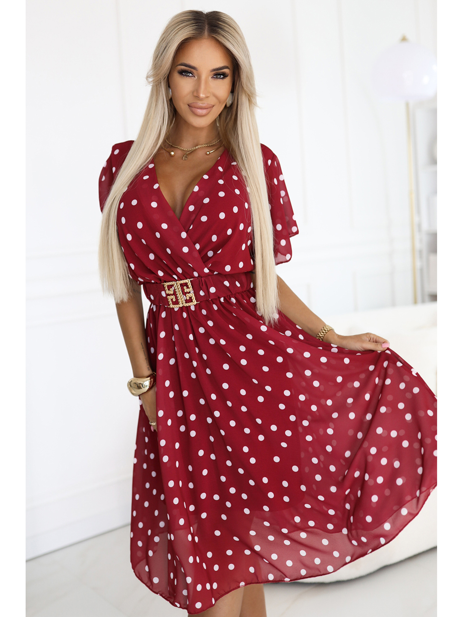 Rakott ruha nyakkivágással és fodrokkal - rózsaszín virágok Numoco POLINA