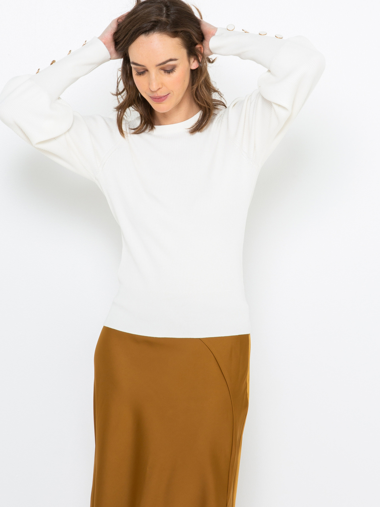 Fehér pulóver luftos ujjakkal