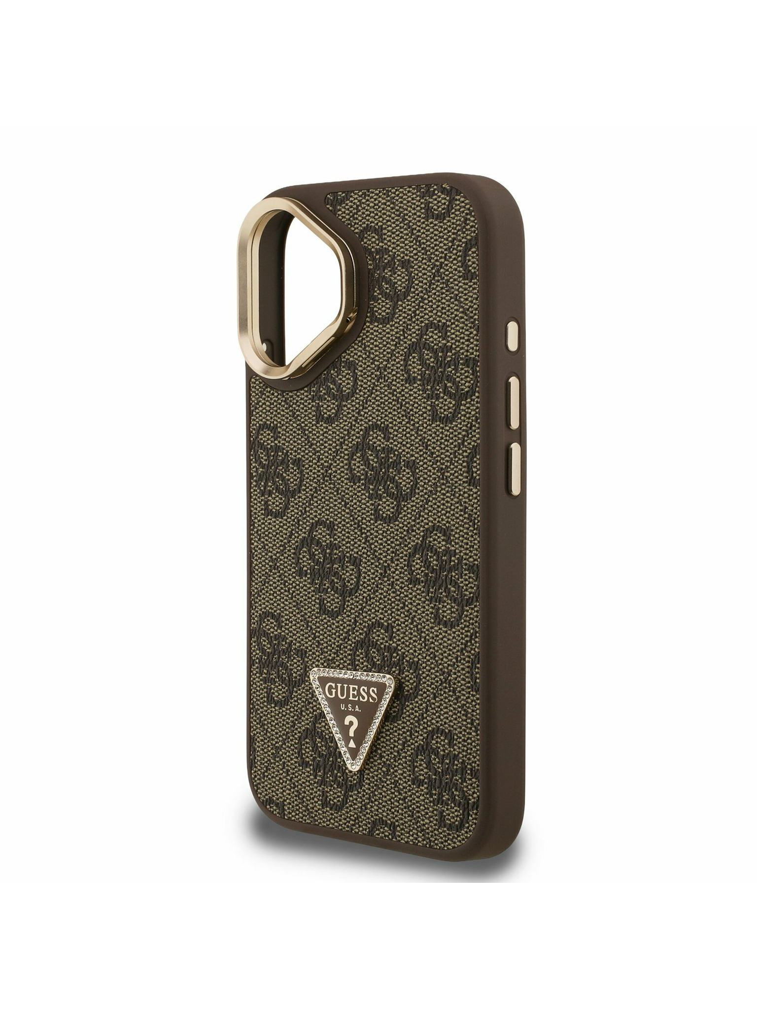 Guess PU 4G Strassz Háromszög Logó Állvány Kamera Keret MagSafe Hátlap iPhone 16 Pro Max Barna