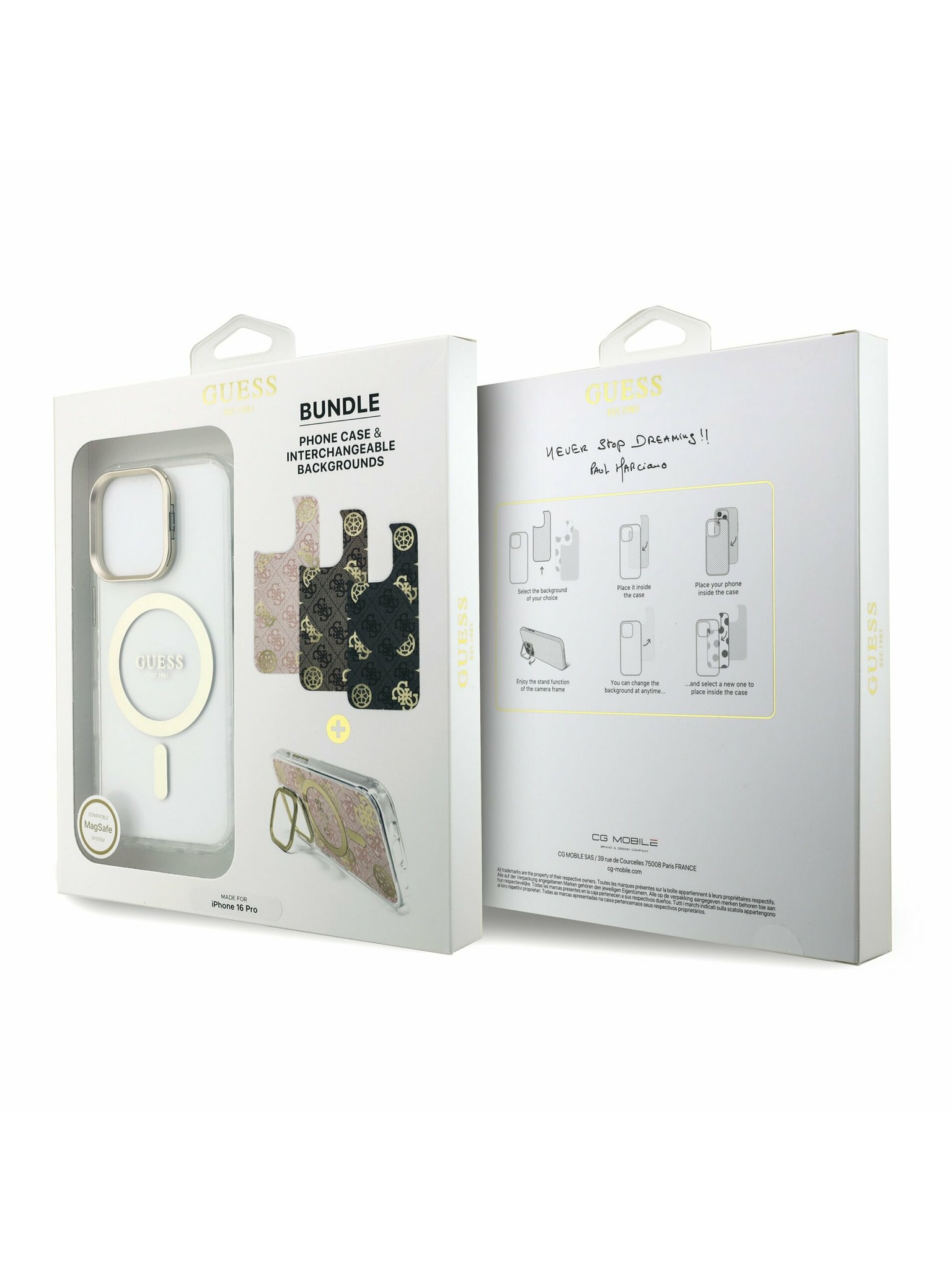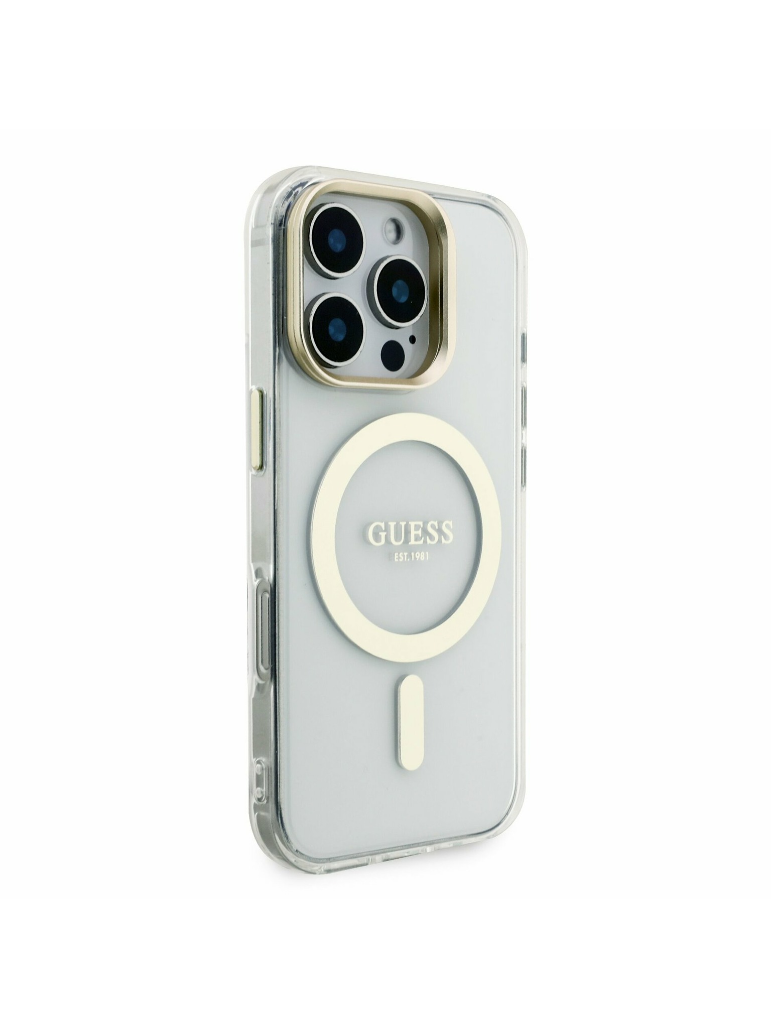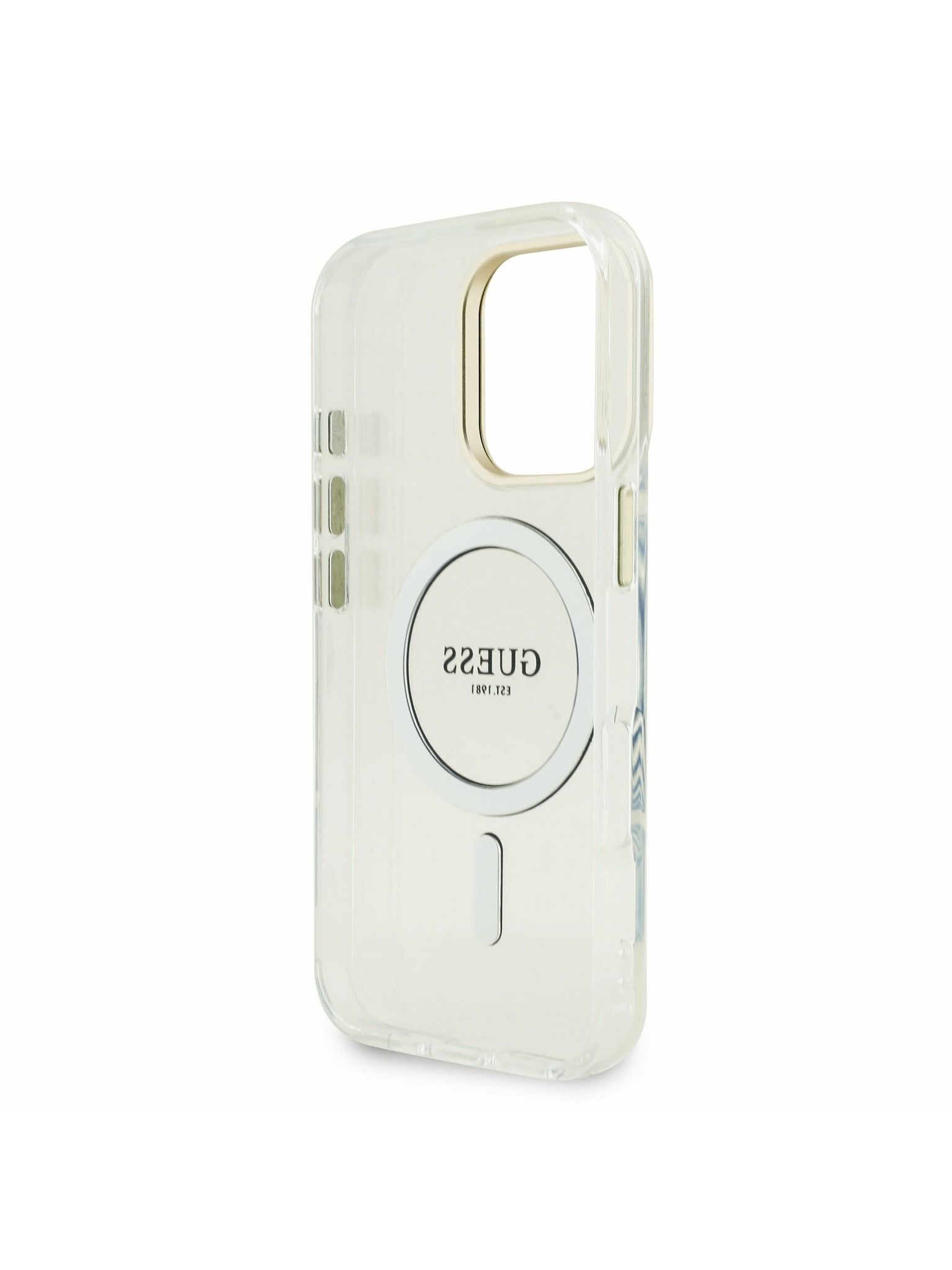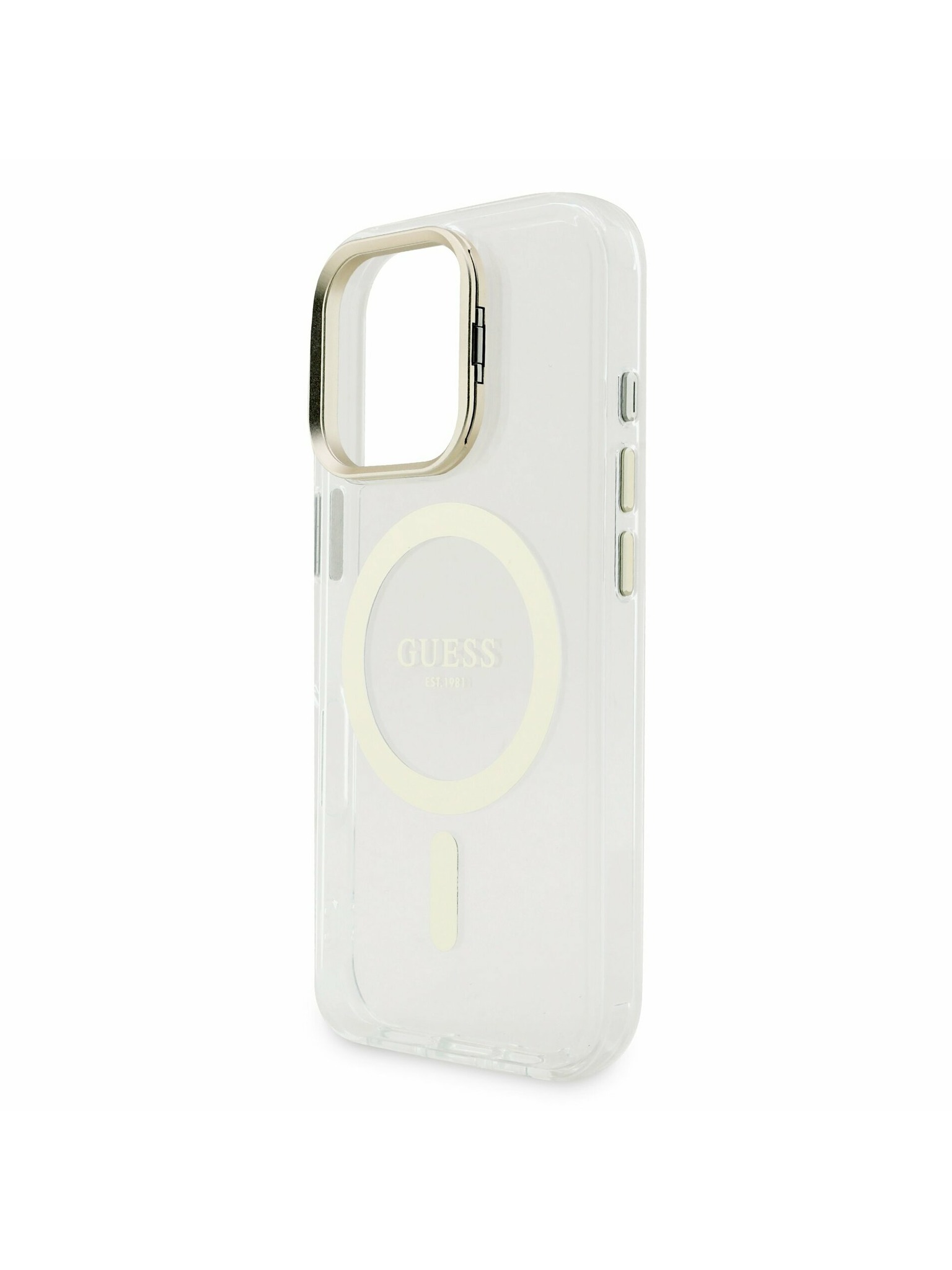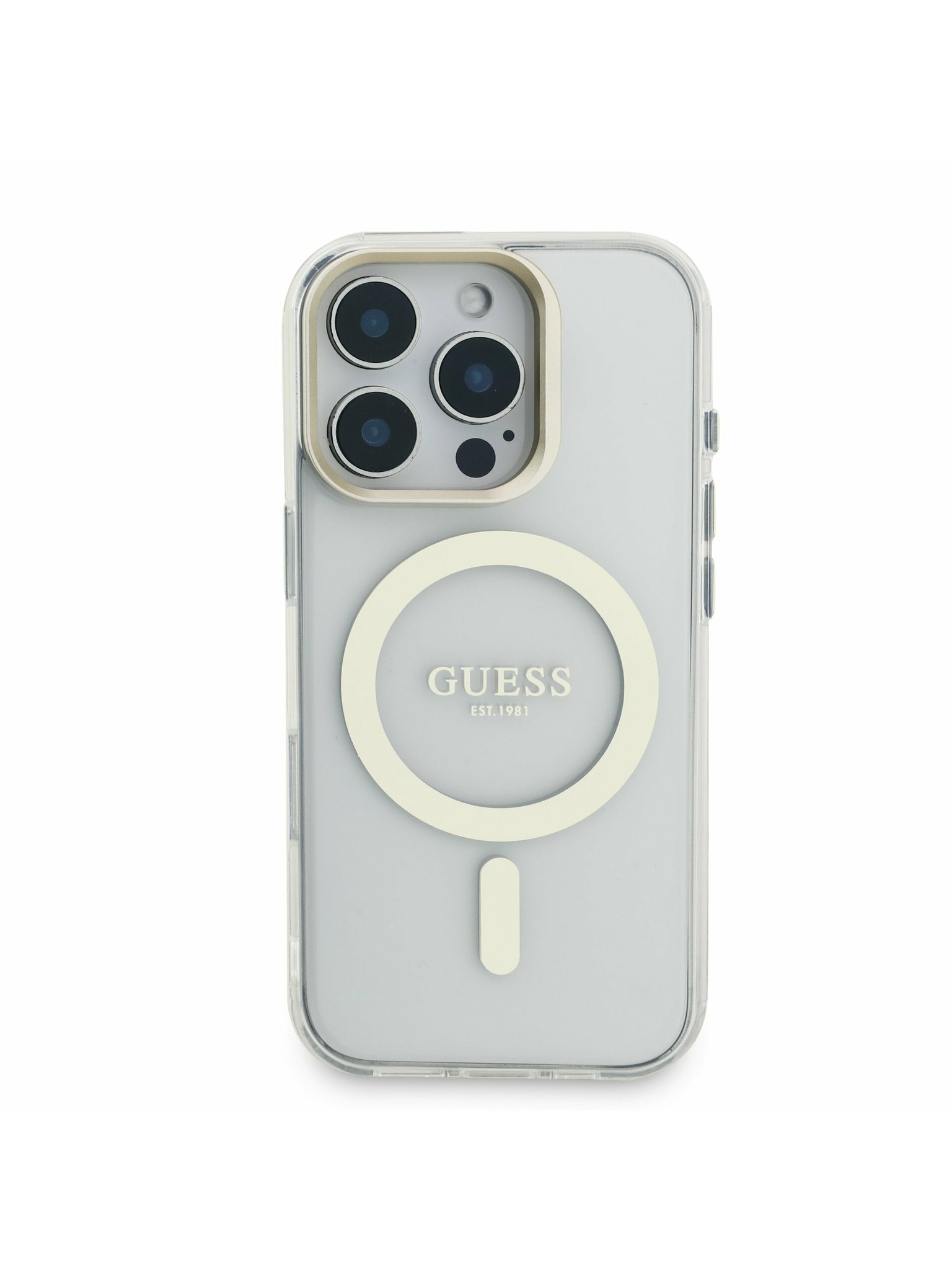 Guess IML Gold Outline Stand Camera Frame MagSafe Hátlap iPhone 15 Pro-hoz Átlátszó