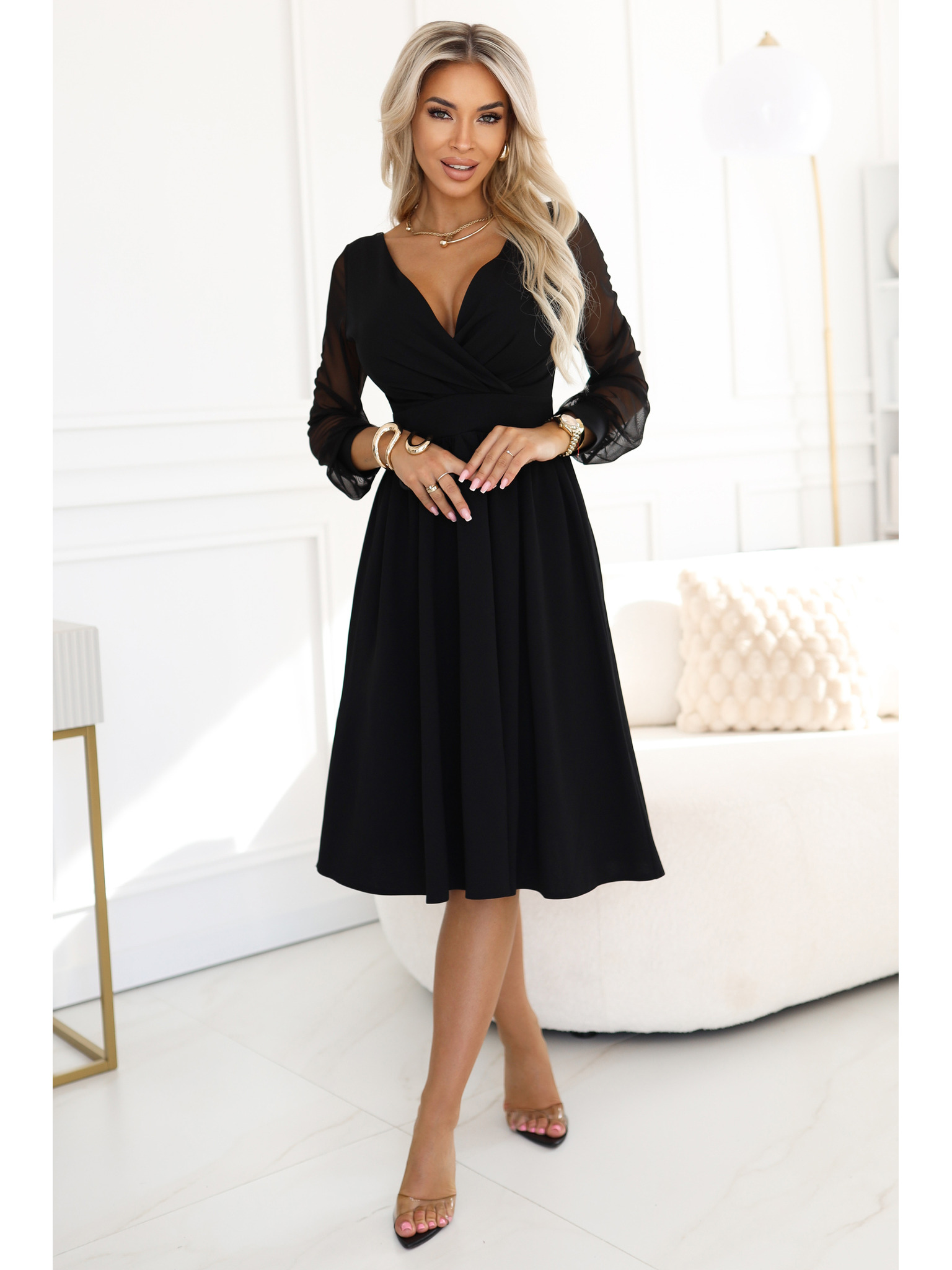 Fényes, hosszú ujjú, nyakkivágású ruha - Fekete Numoco NELA