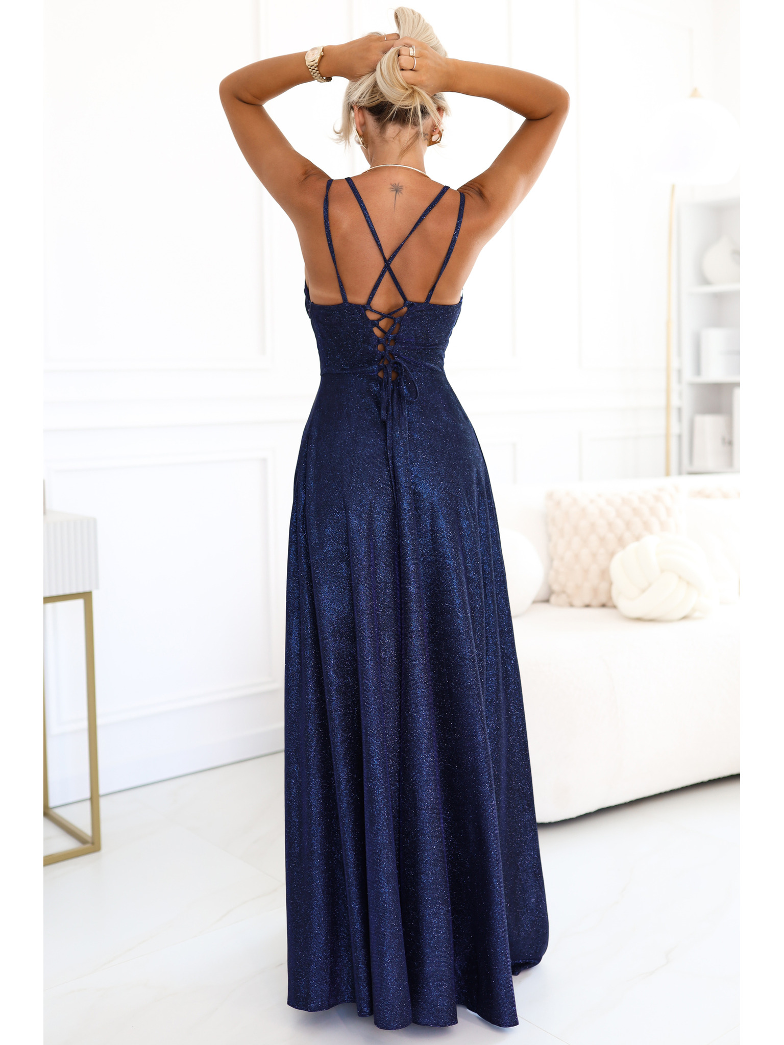 AURELIA Hosszú ruha hasítékkal és gyémánt kivágással - bézs csillogással