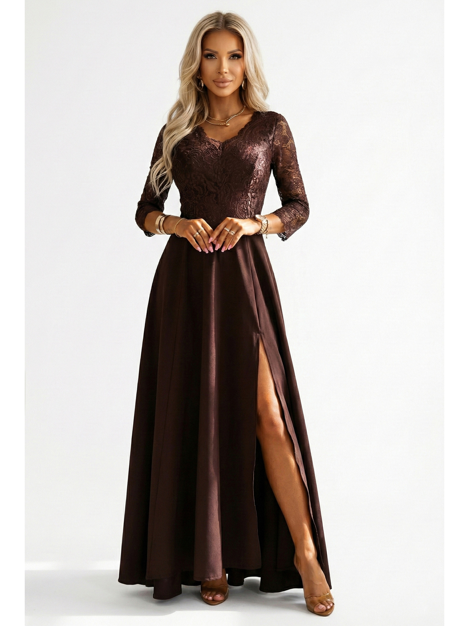 AMBER Elegáns hosszú csipke ruha kivágással - csokoládébarna
