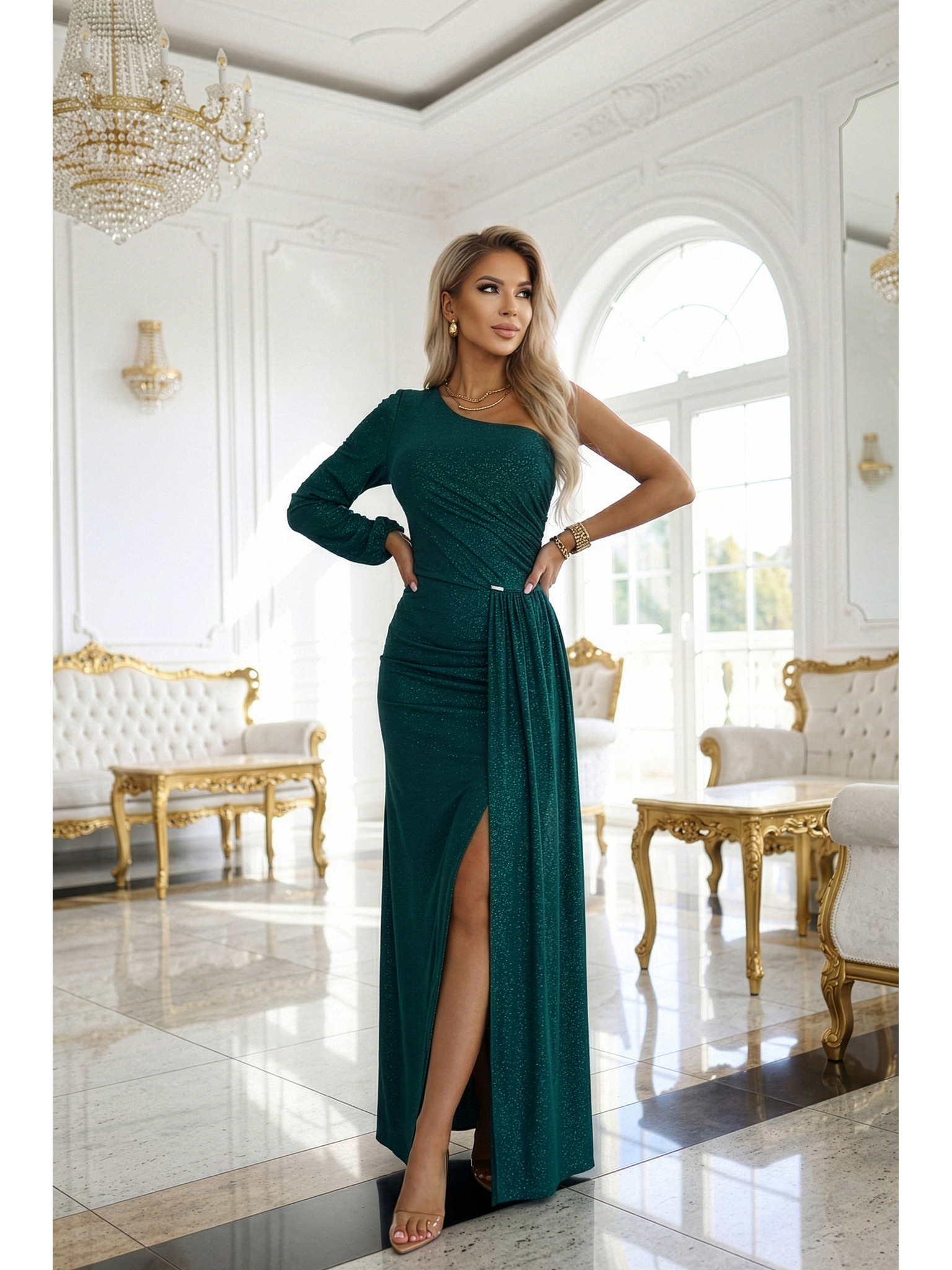SELENA csillogó hosszú ruha egy vállas hasítékkal - zöld csillogással