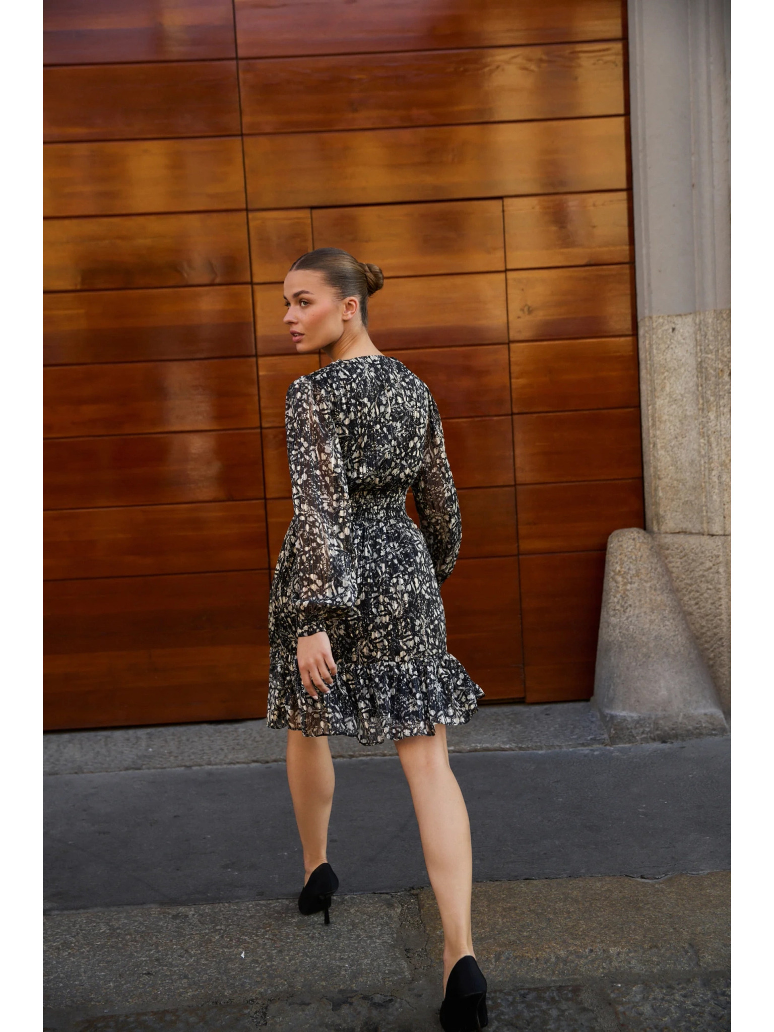 Fényes, hosszú ujjú, nyakkivágású ruha - Fekete Numoco NELA
