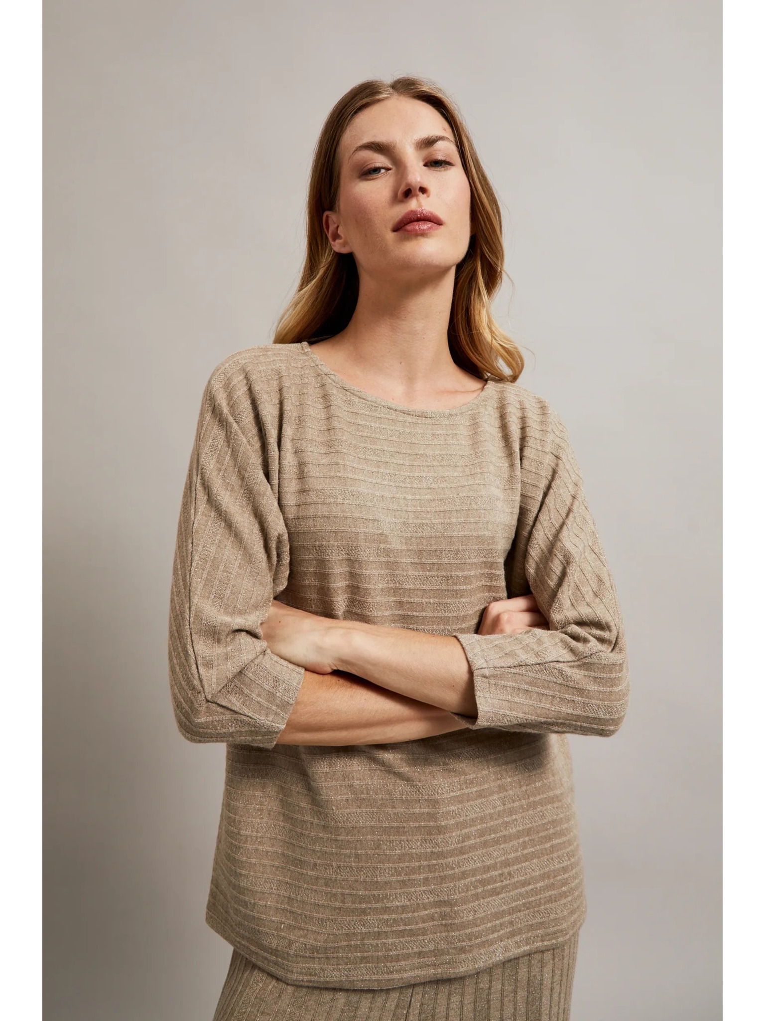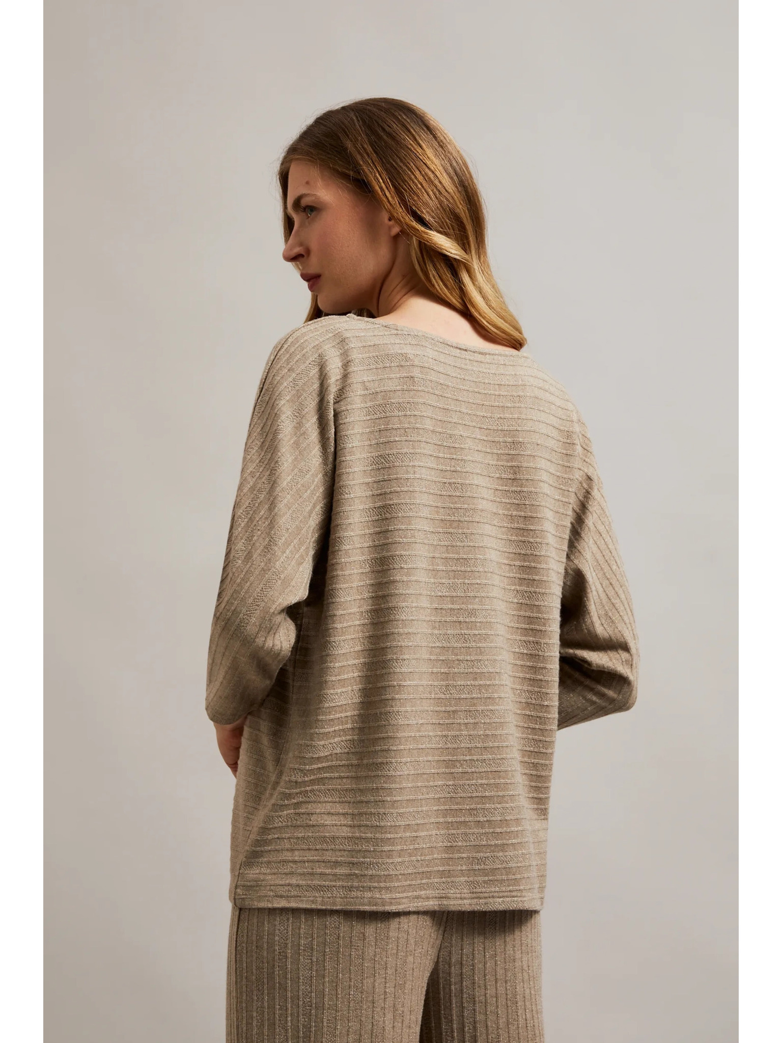 Bordázott bézs fodros ujjú pulóver Moodo