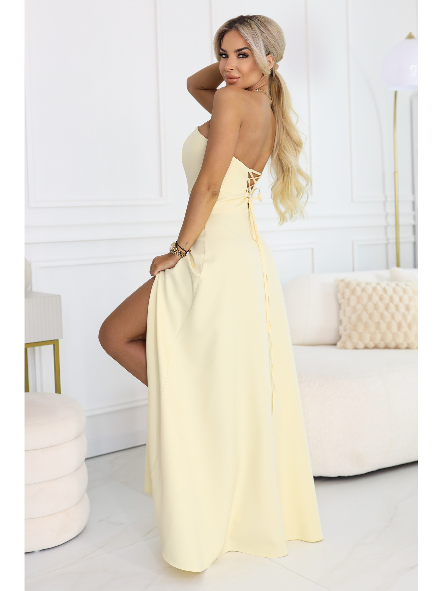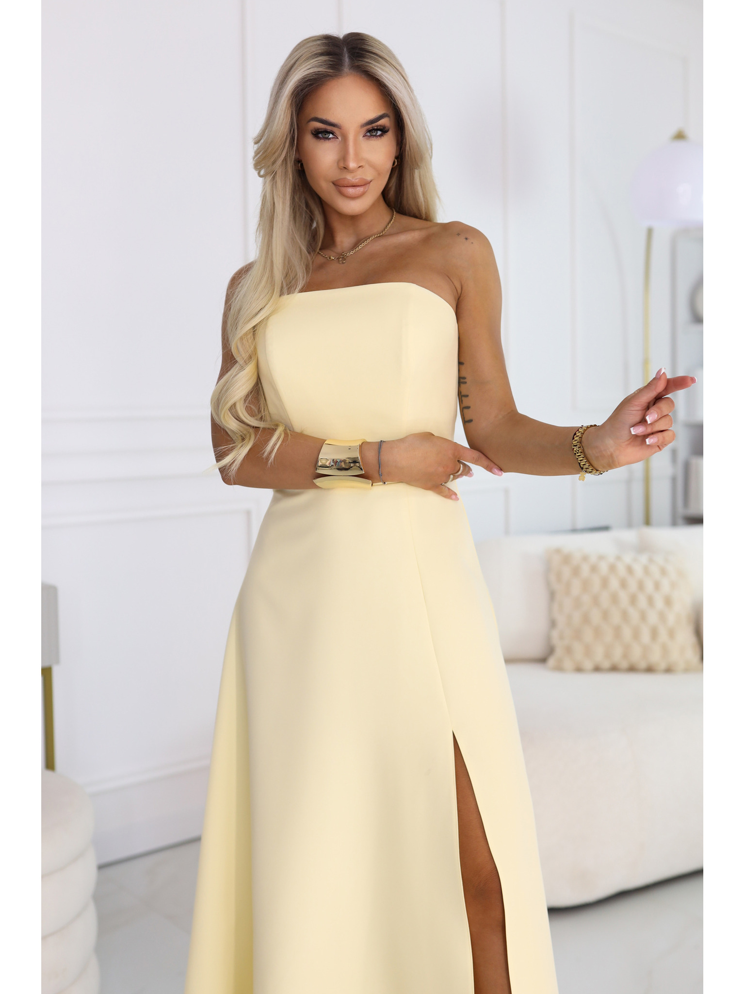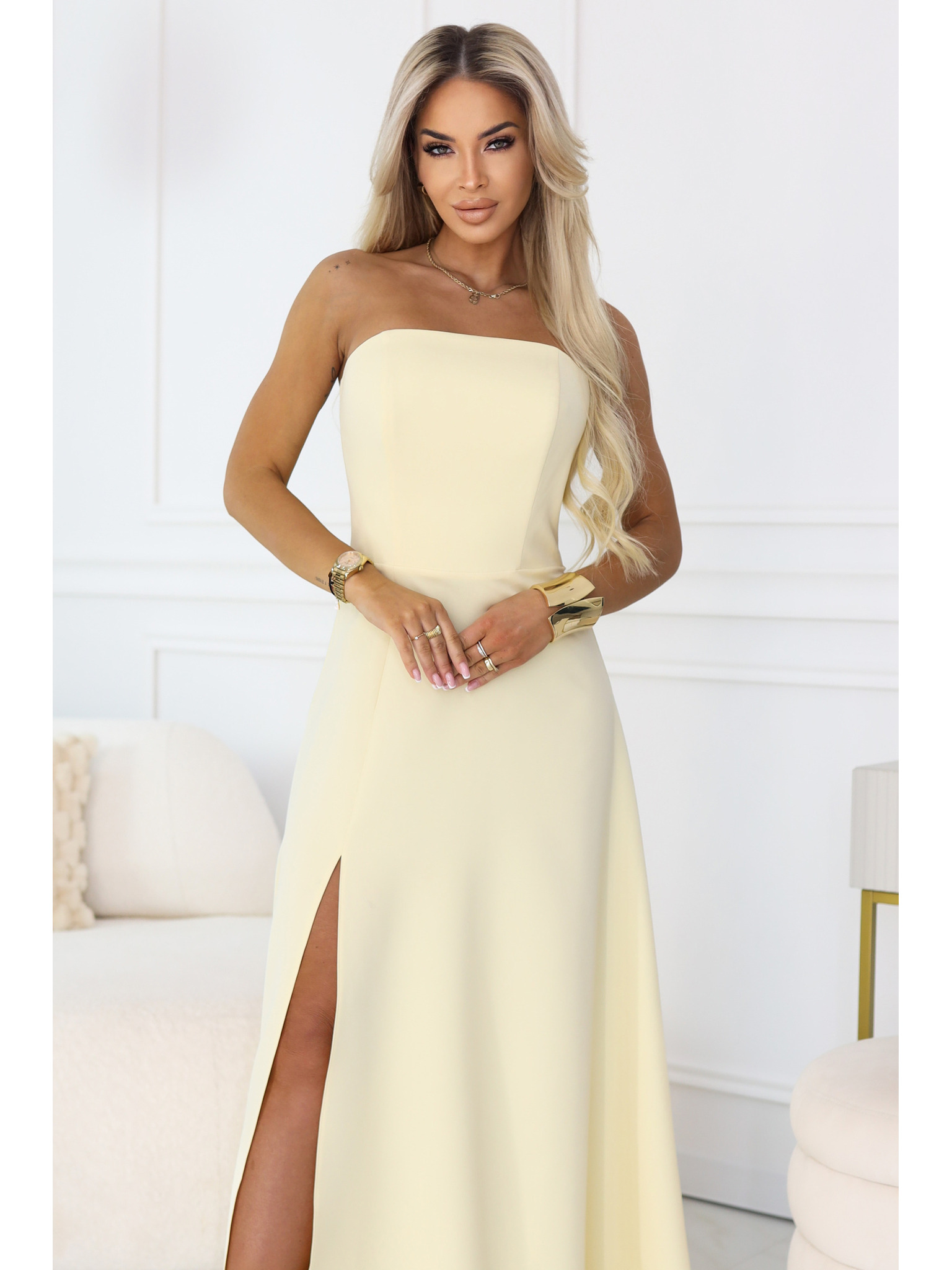 JENNIFER hosszú ruha lábrésznél hasítékkal, ujjakkal és kivágással - bézs
