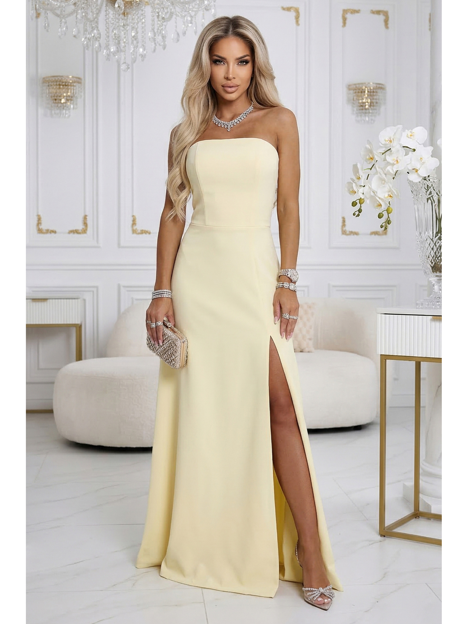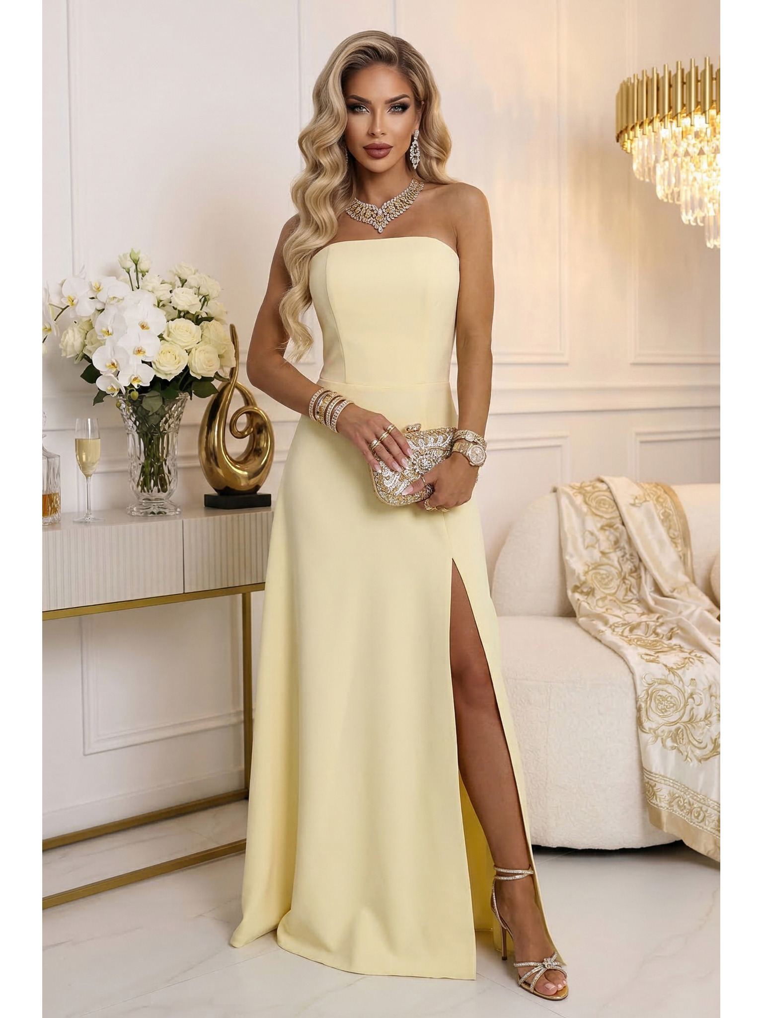 CHIARA Maxi ruha spagettipánttal, átlapolós dekoltázzsal és oldalsó hasítékkal - pezsgő bézs csillogós