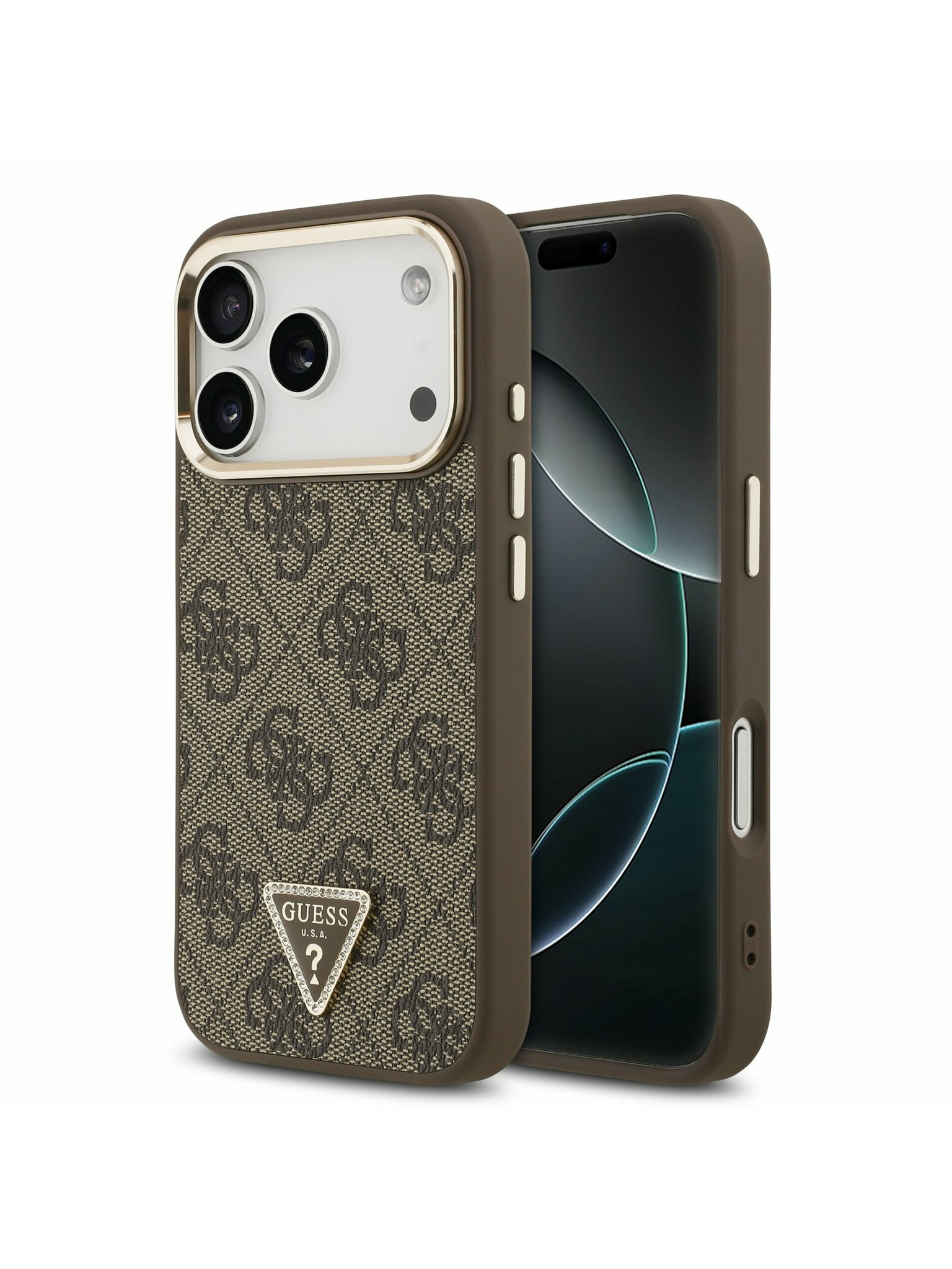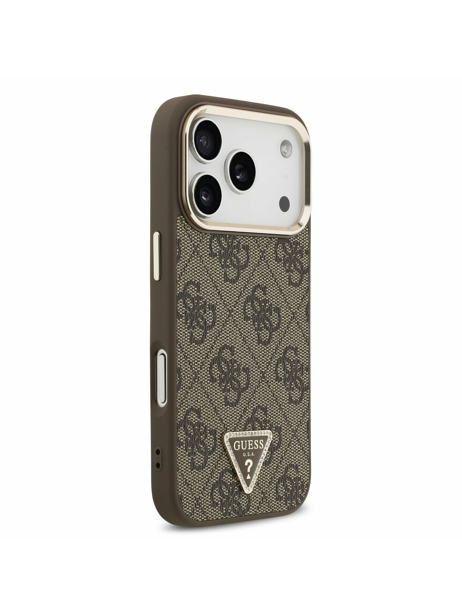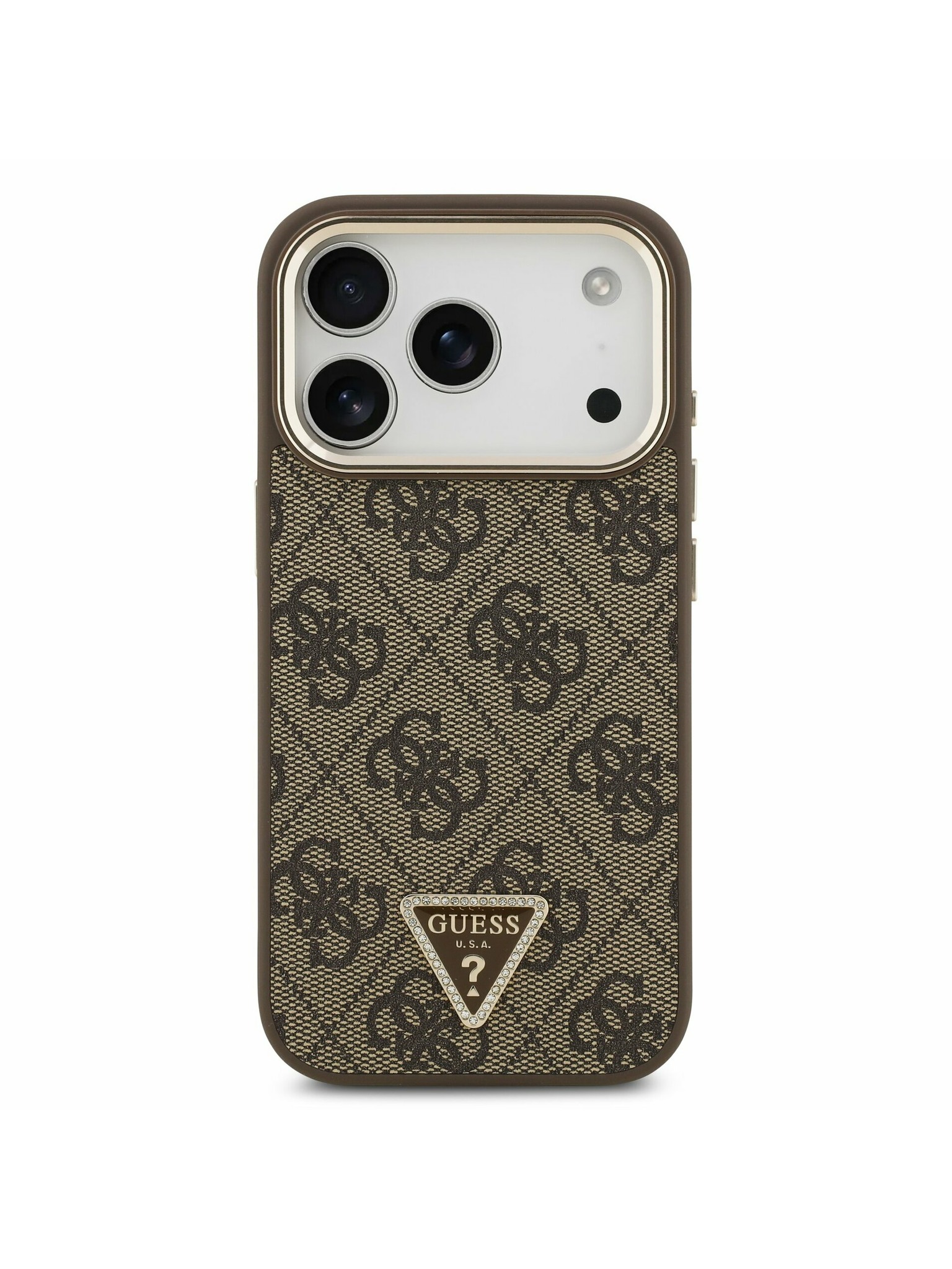 Guess PU Leather 4G Strass Triangle Logo Gold Frame MagSafe Hátoldal iPhone 17 Pro Brown